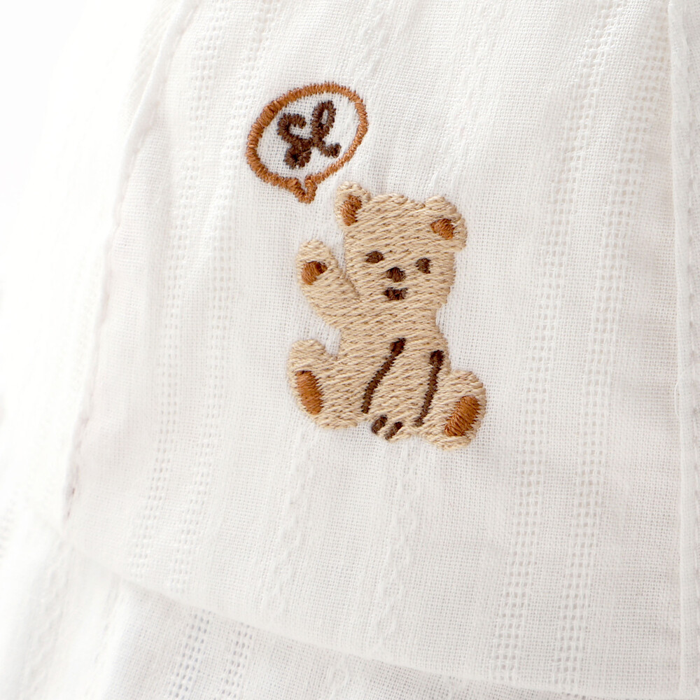カラーごとに異なるモチーフを主役に、ベージュ(オフホワイト)はやさしい表情のクマさん、グリーンは元気いっぱいの恐竜、ネイビーは海を泳ぐクジラ。