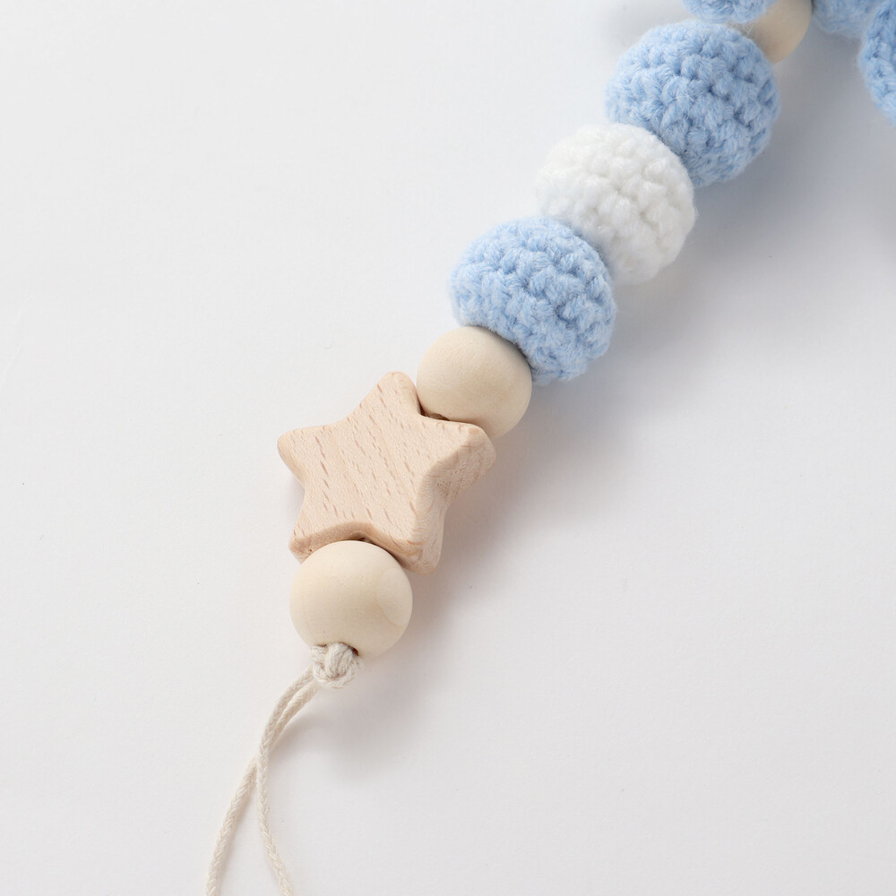 ぬくもりを感じる木のパーツと、ふんわり柔らかな編地を組み合わせたデザイン。
