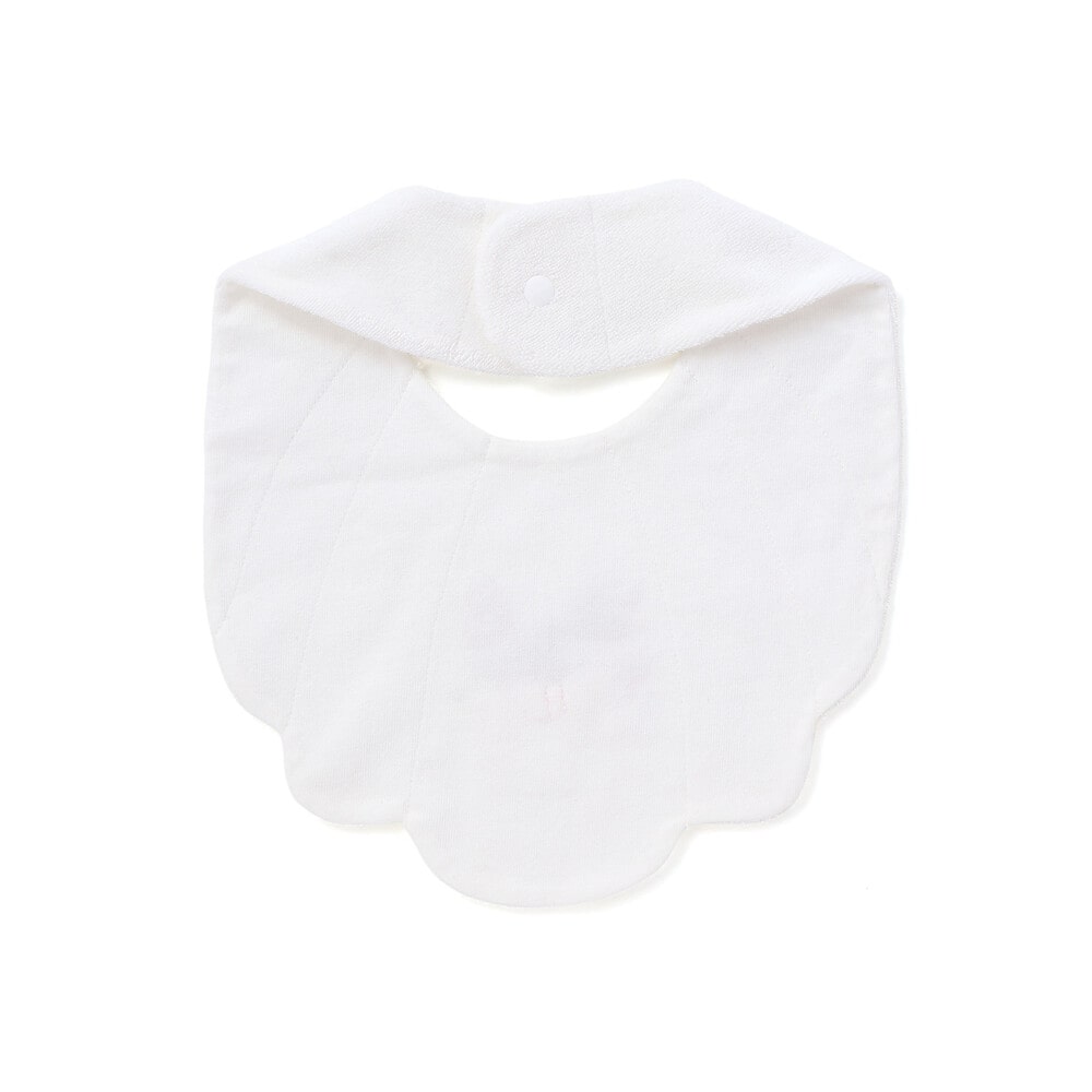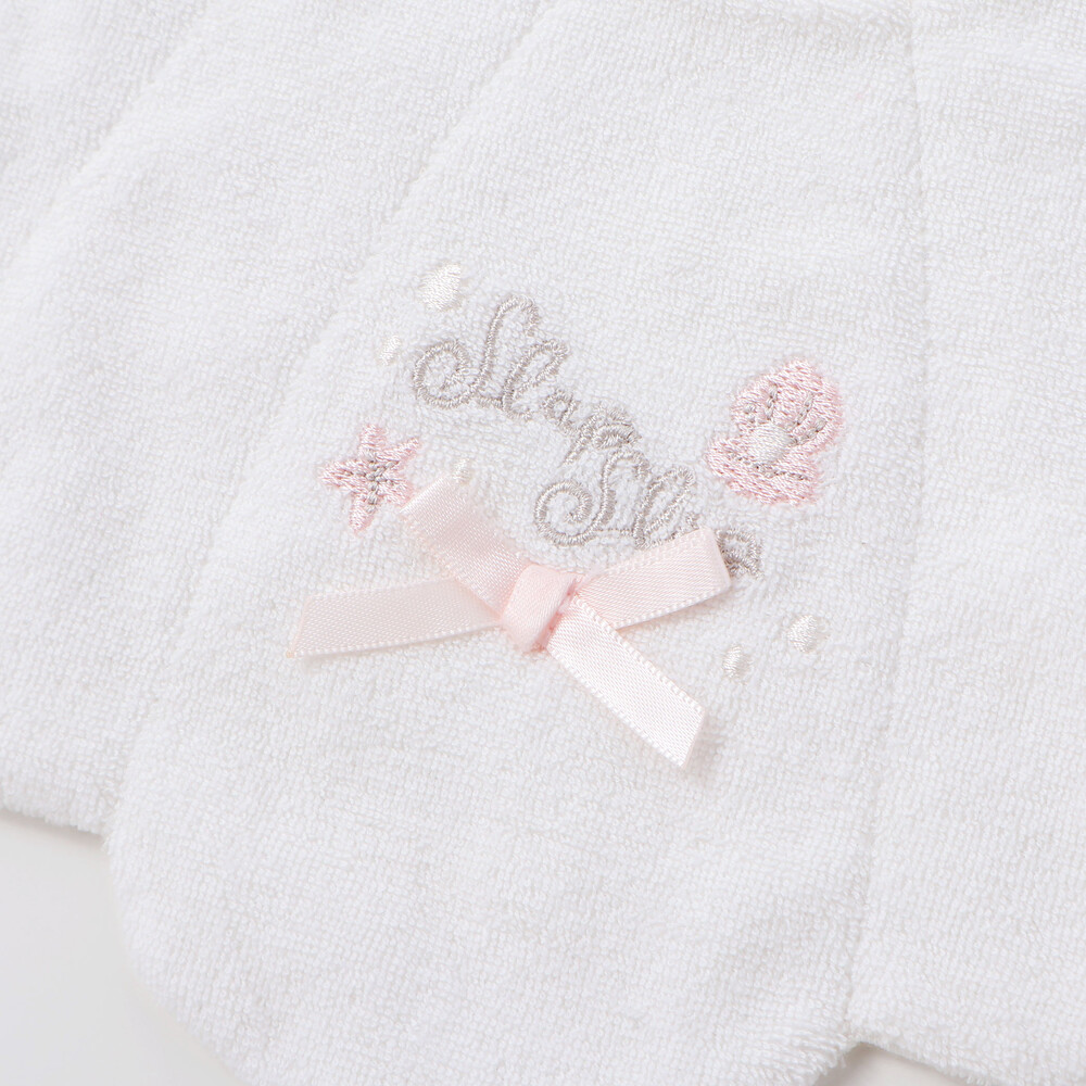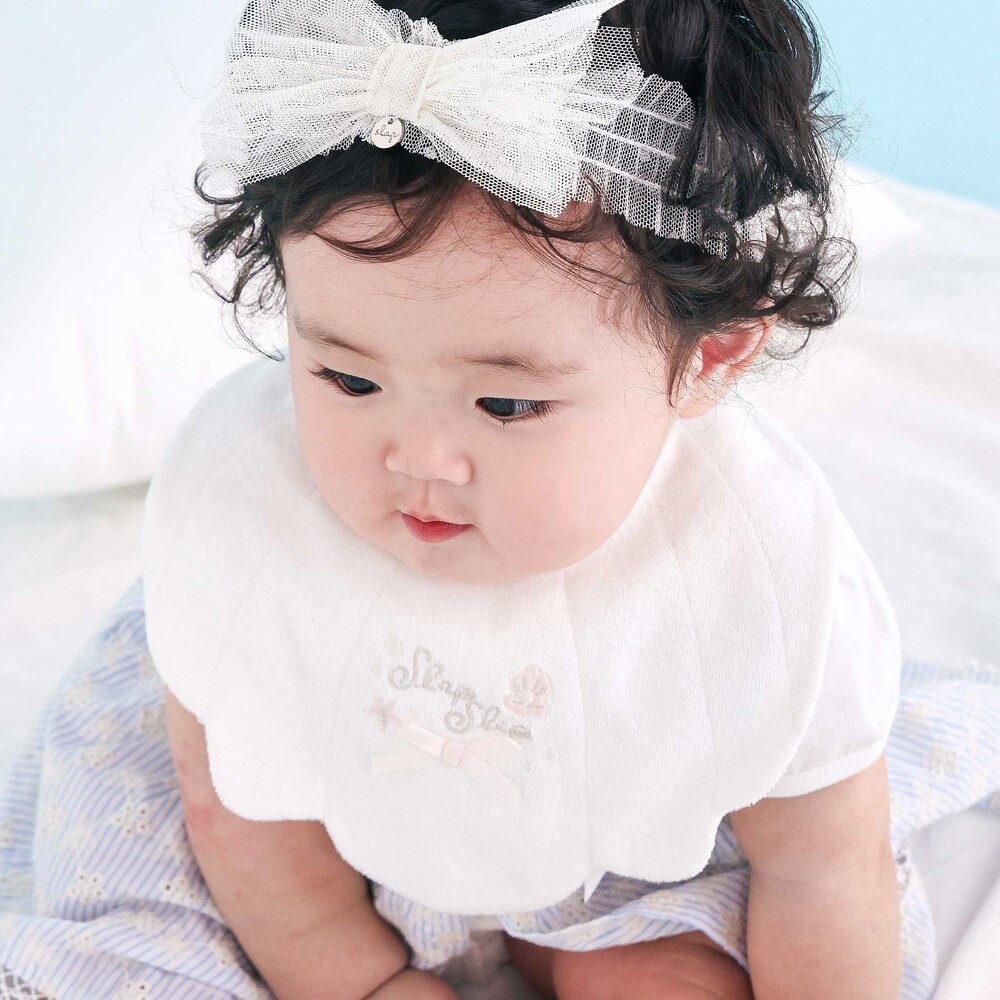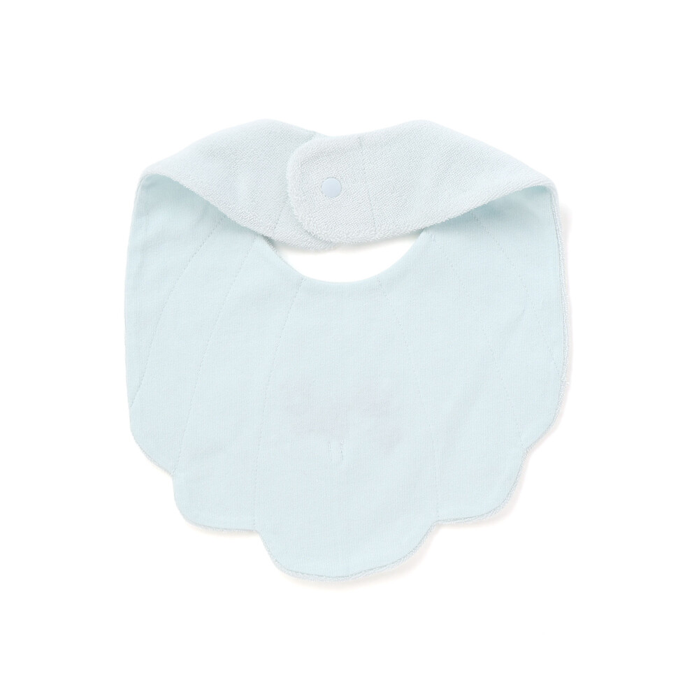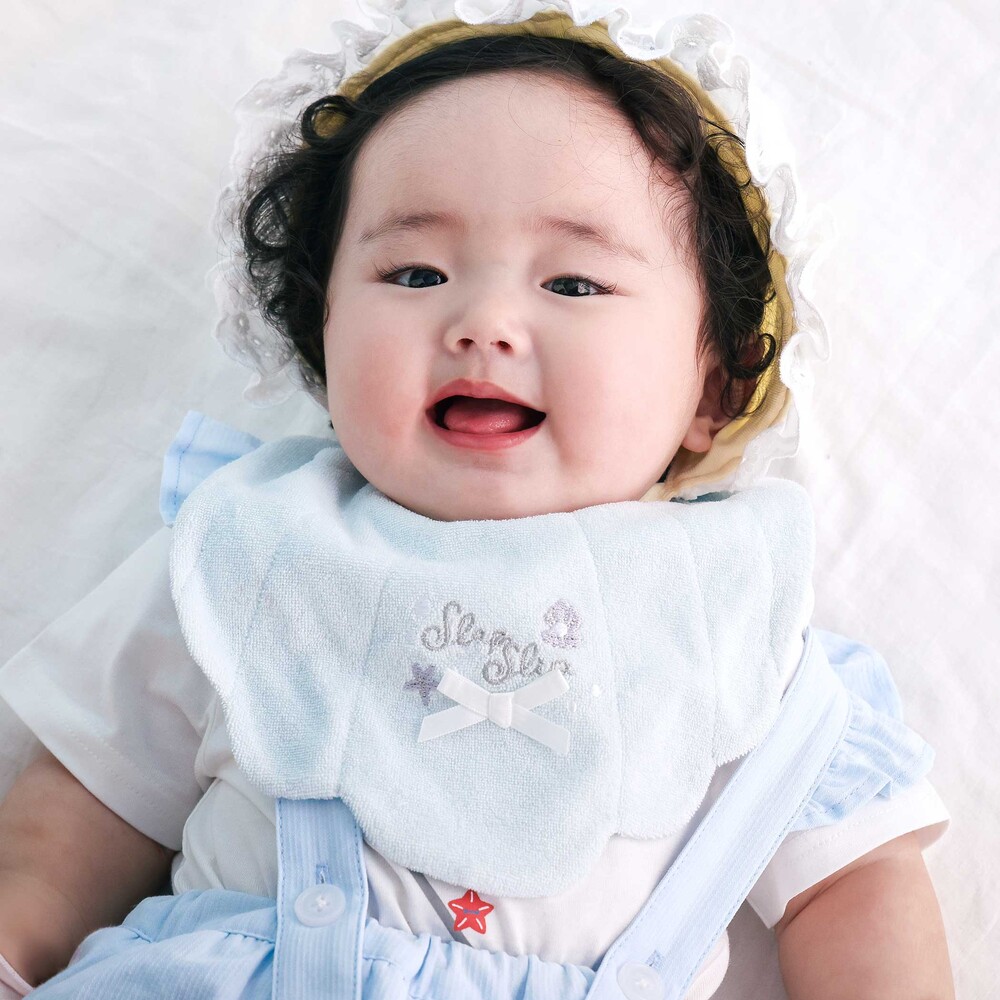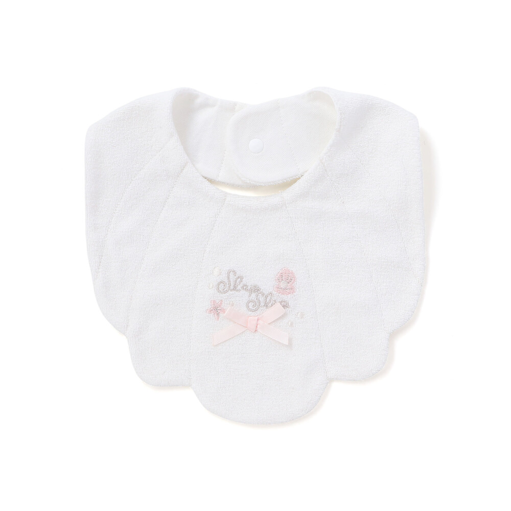 マリンムードたっぷりの可愛らしい女の子ベビー用シェル型スタイ。