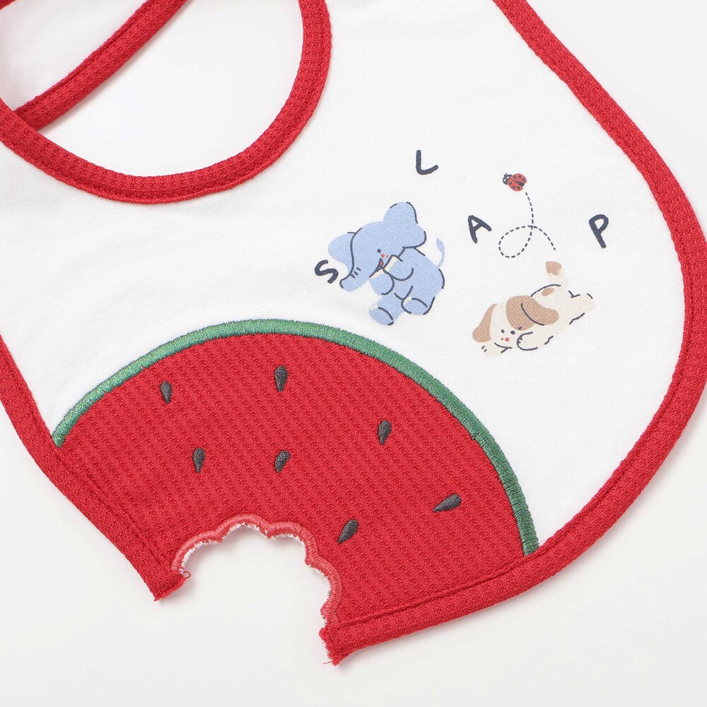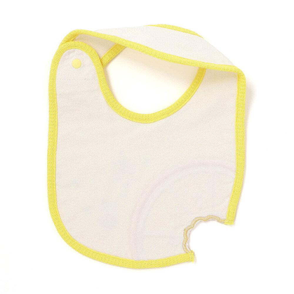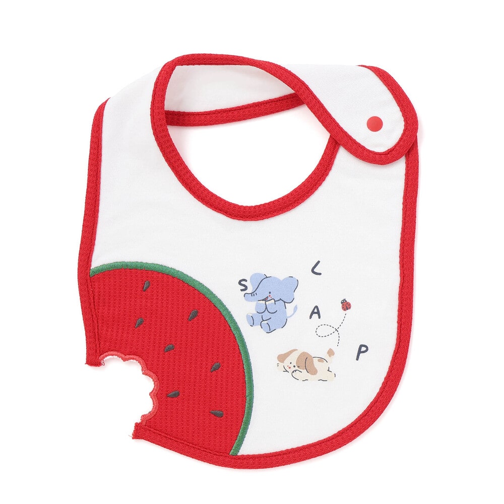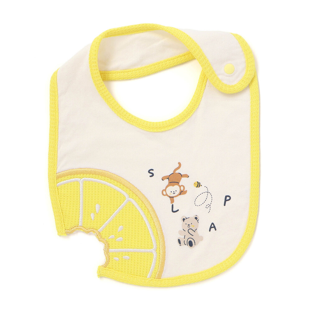 モチーフの果物がかじられたようなデザインの男の子ベビー用スタイ。