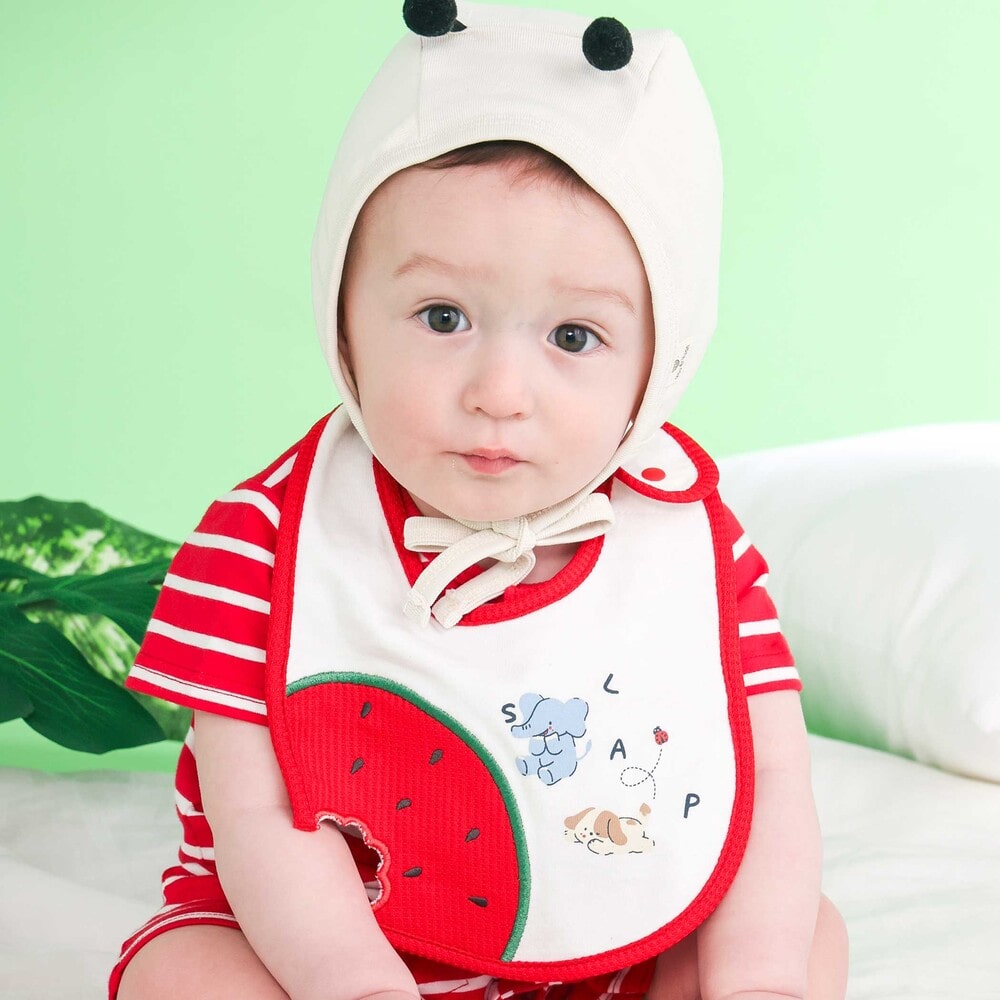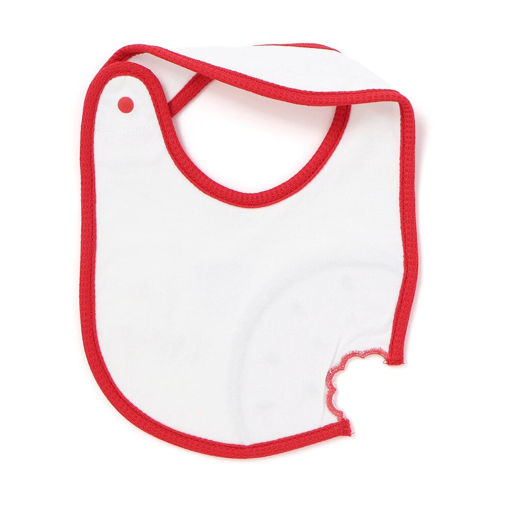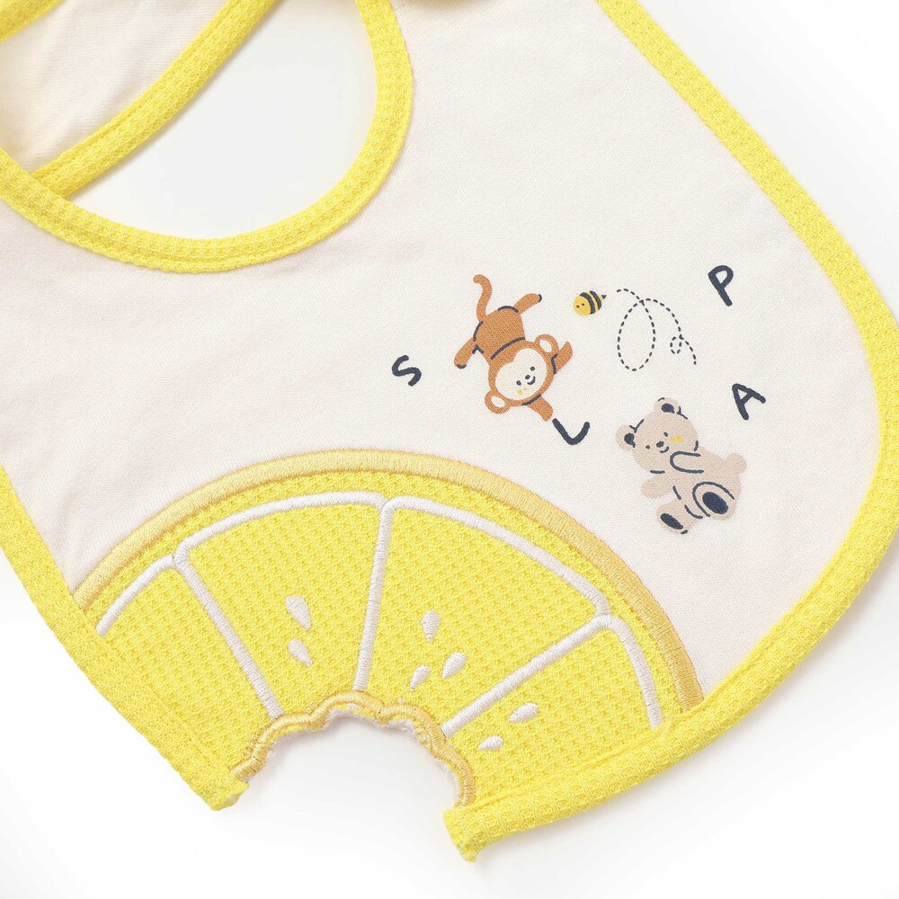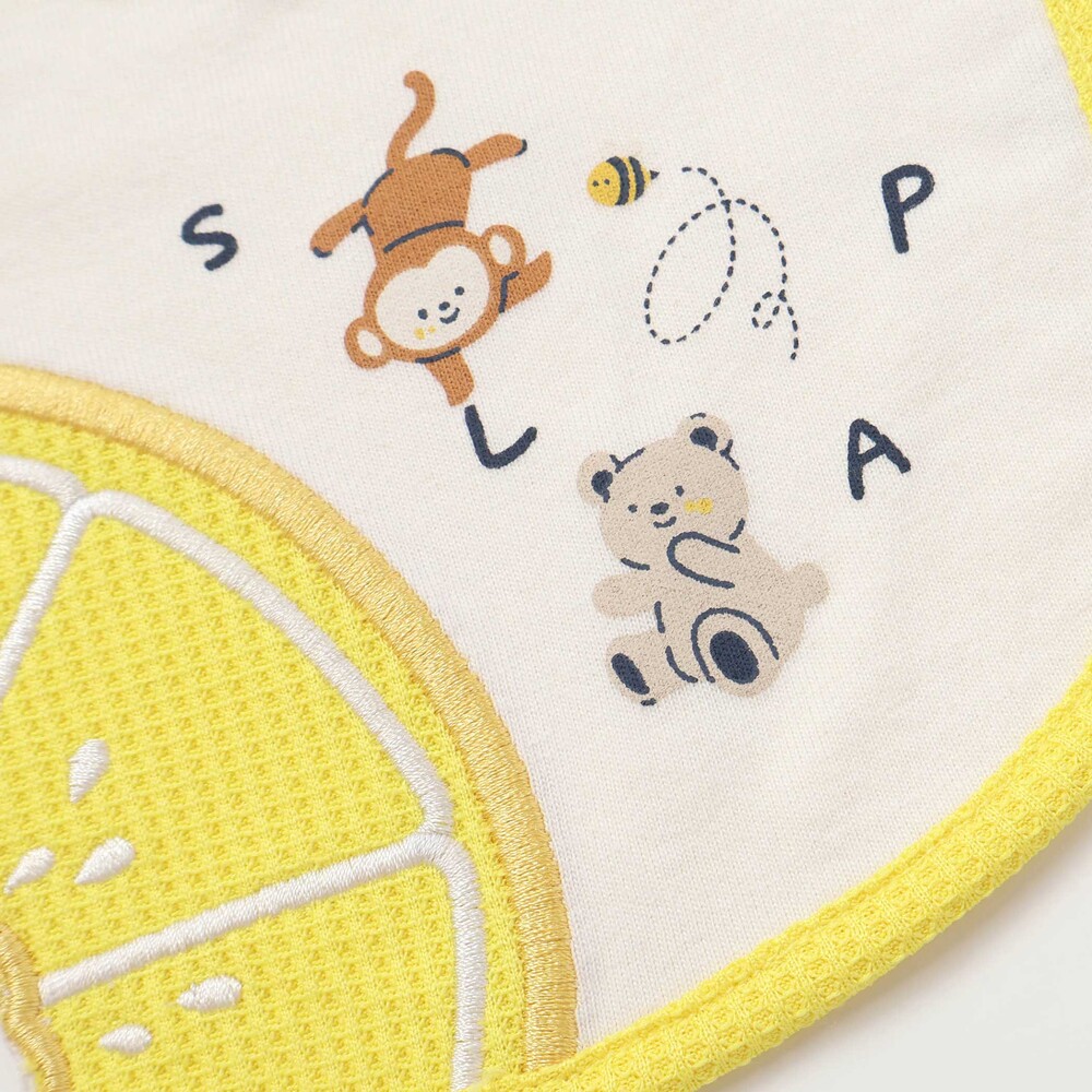 モチーフの果物がかじられたようなデザインの男の子ベビー用スタイ。
