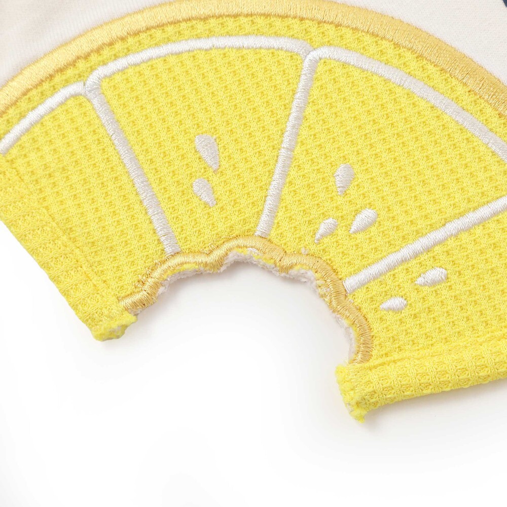 果物モチーフは立体感のあるワッフル素材を使用し、身生地にはやわらかな天竺素材を合わせて、赤ちゃんのお肌にもやさしい仕上がりに。