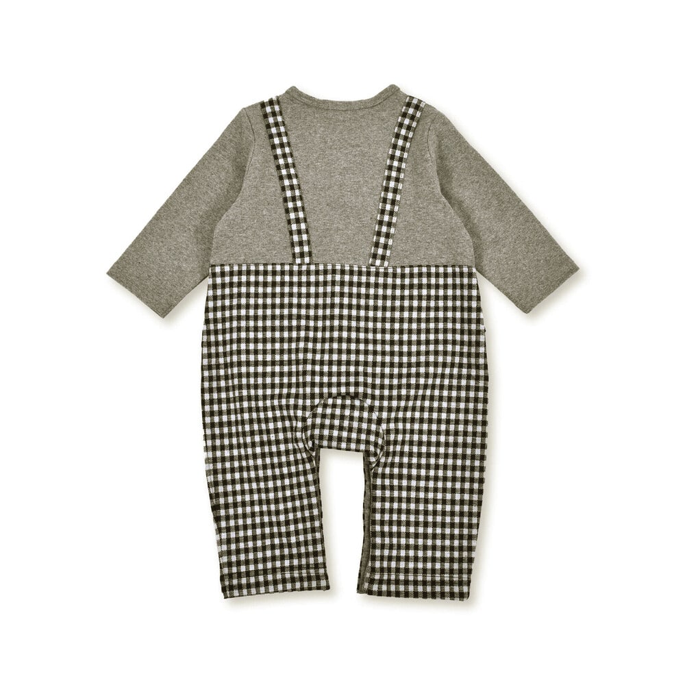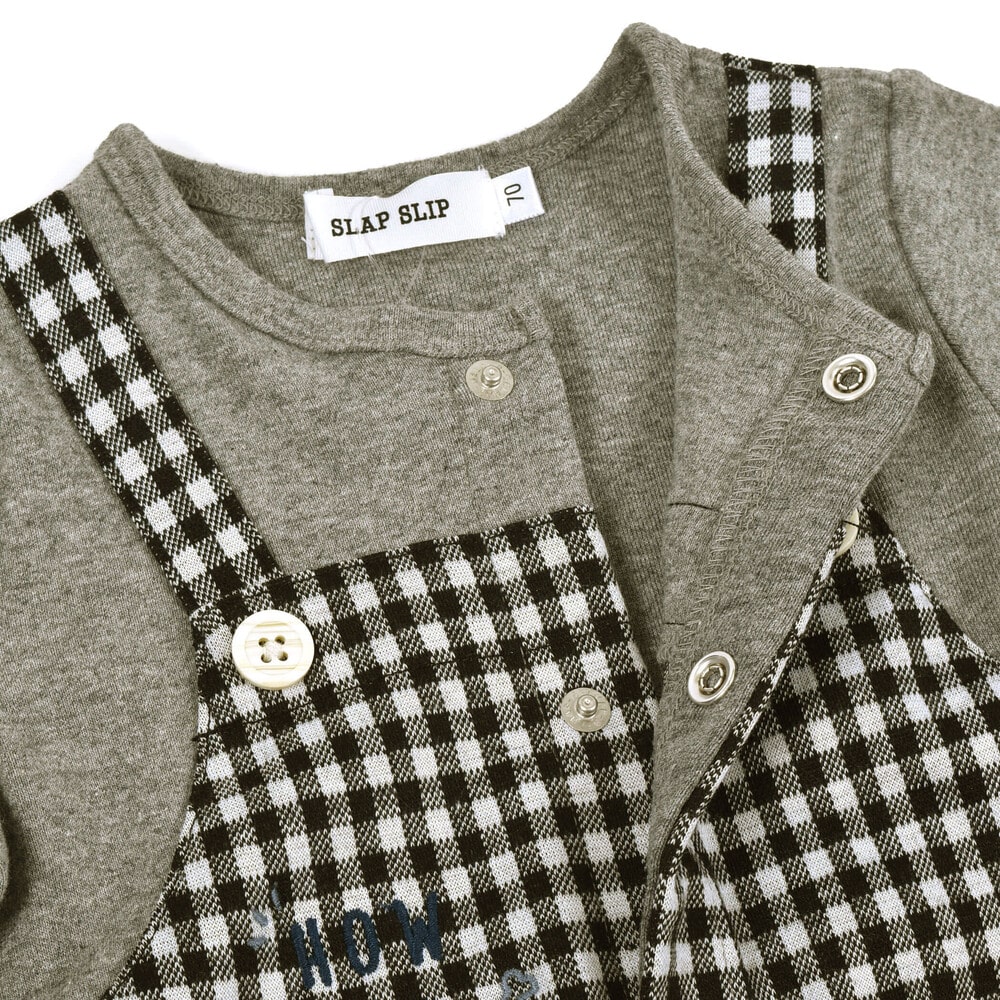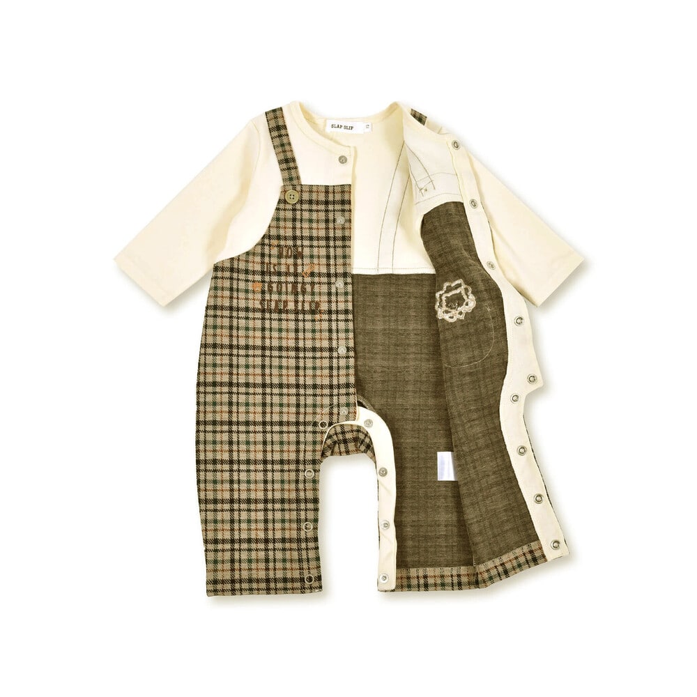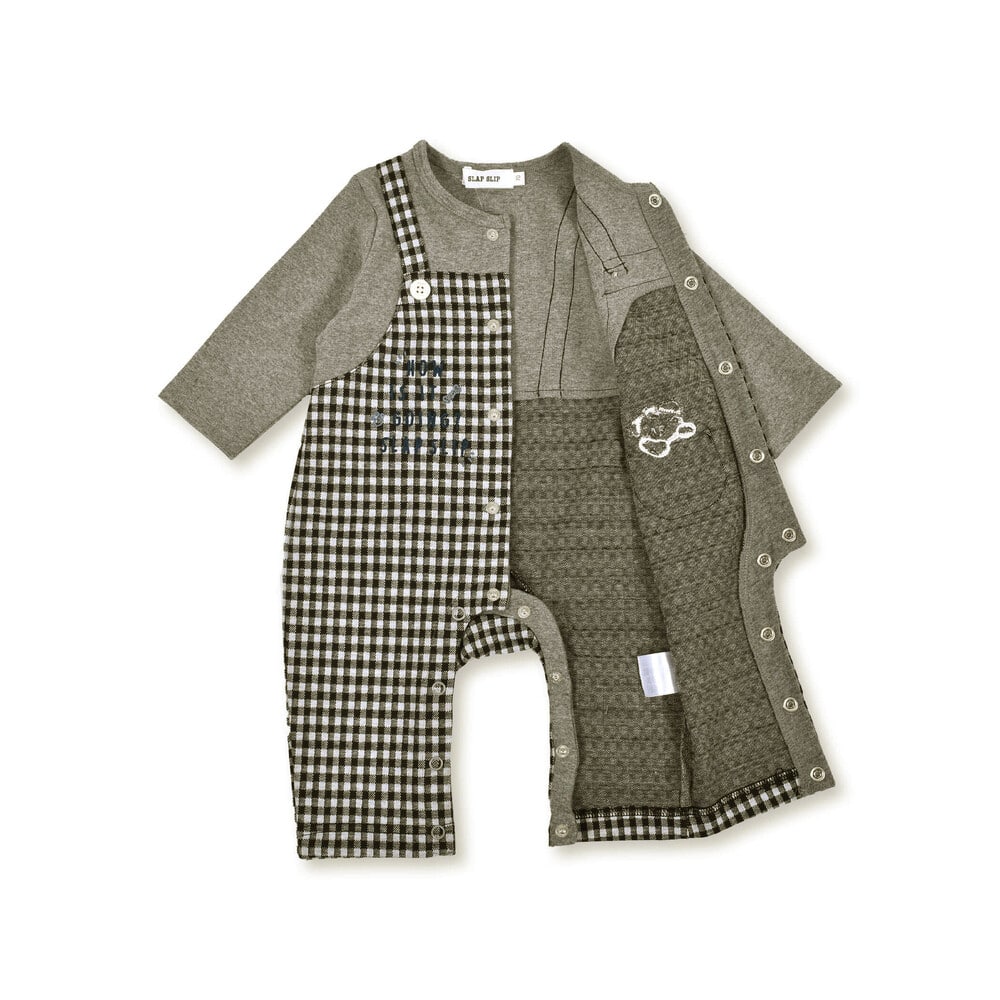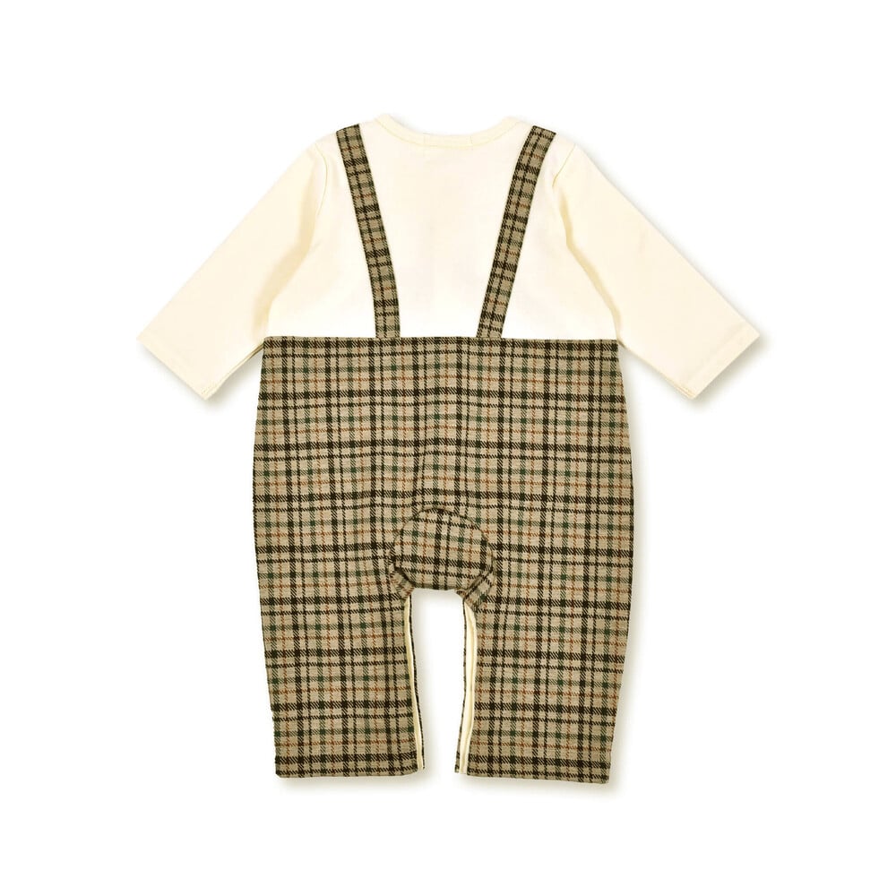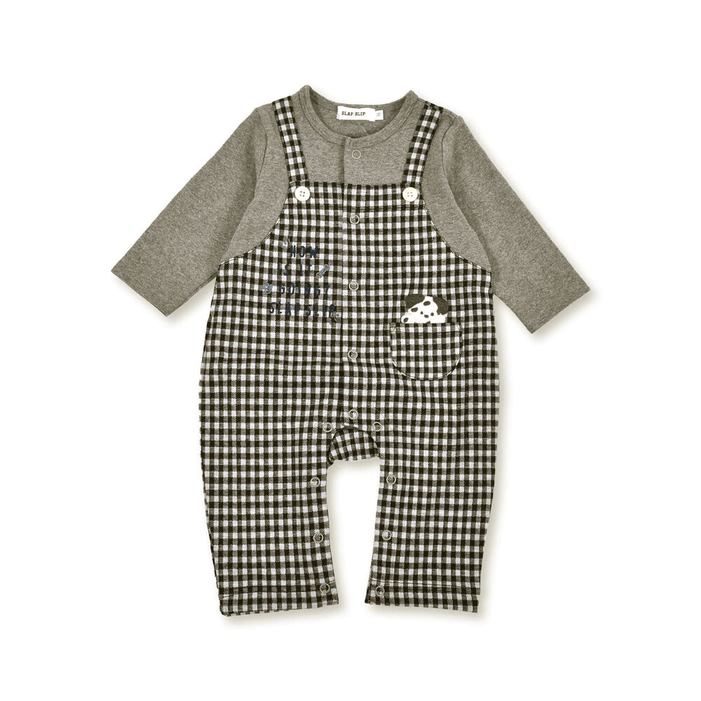 カットソー生地にサロペットをドッキングした、長袖タイプのレイヤード風ロンパース。