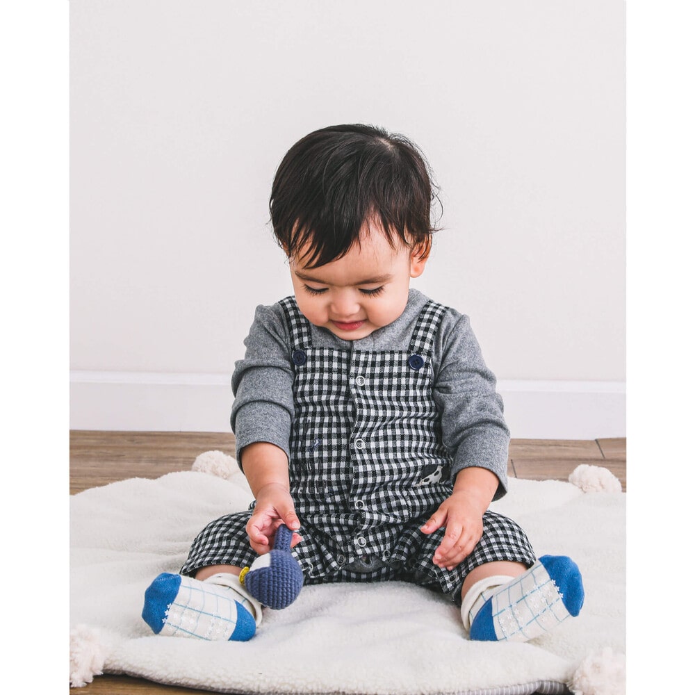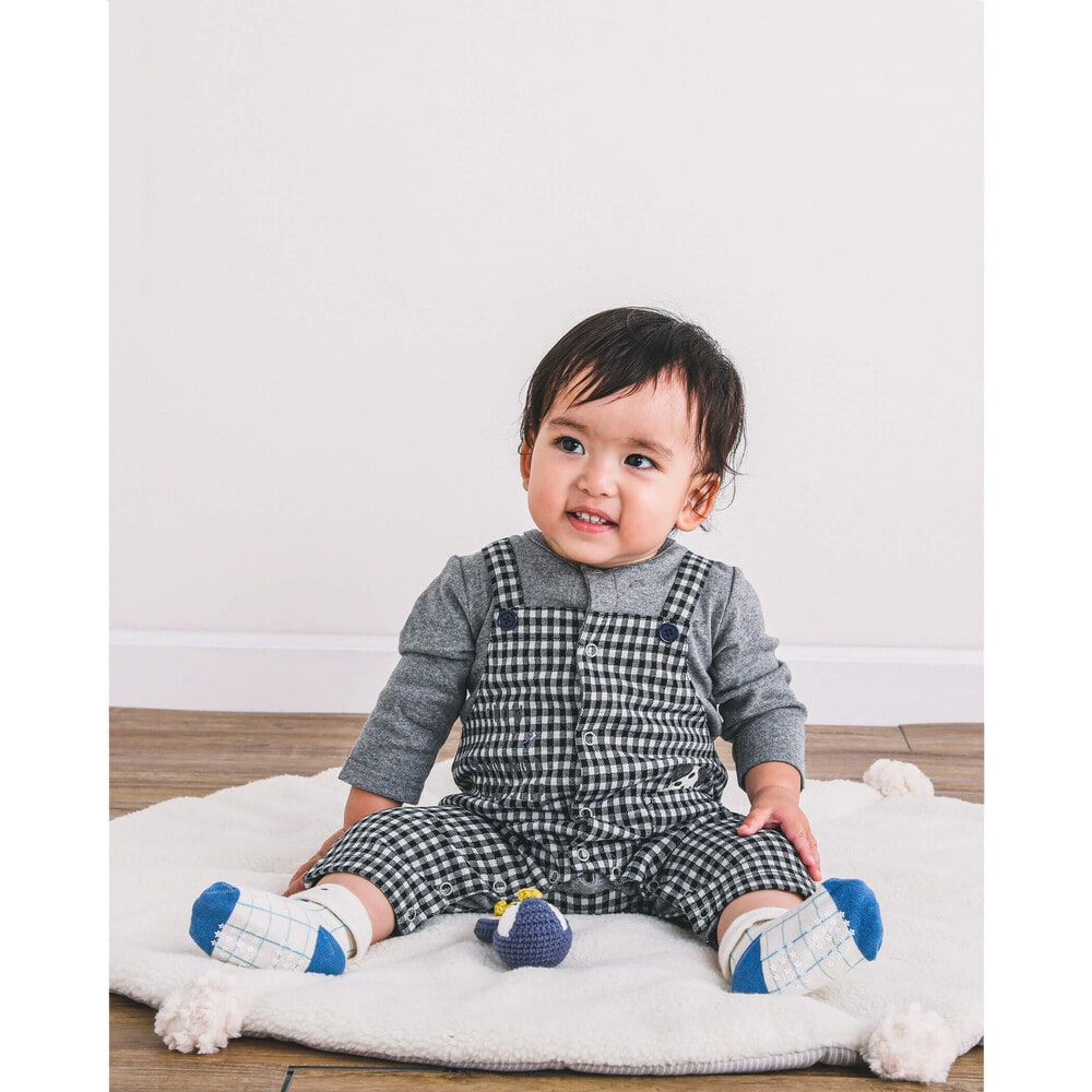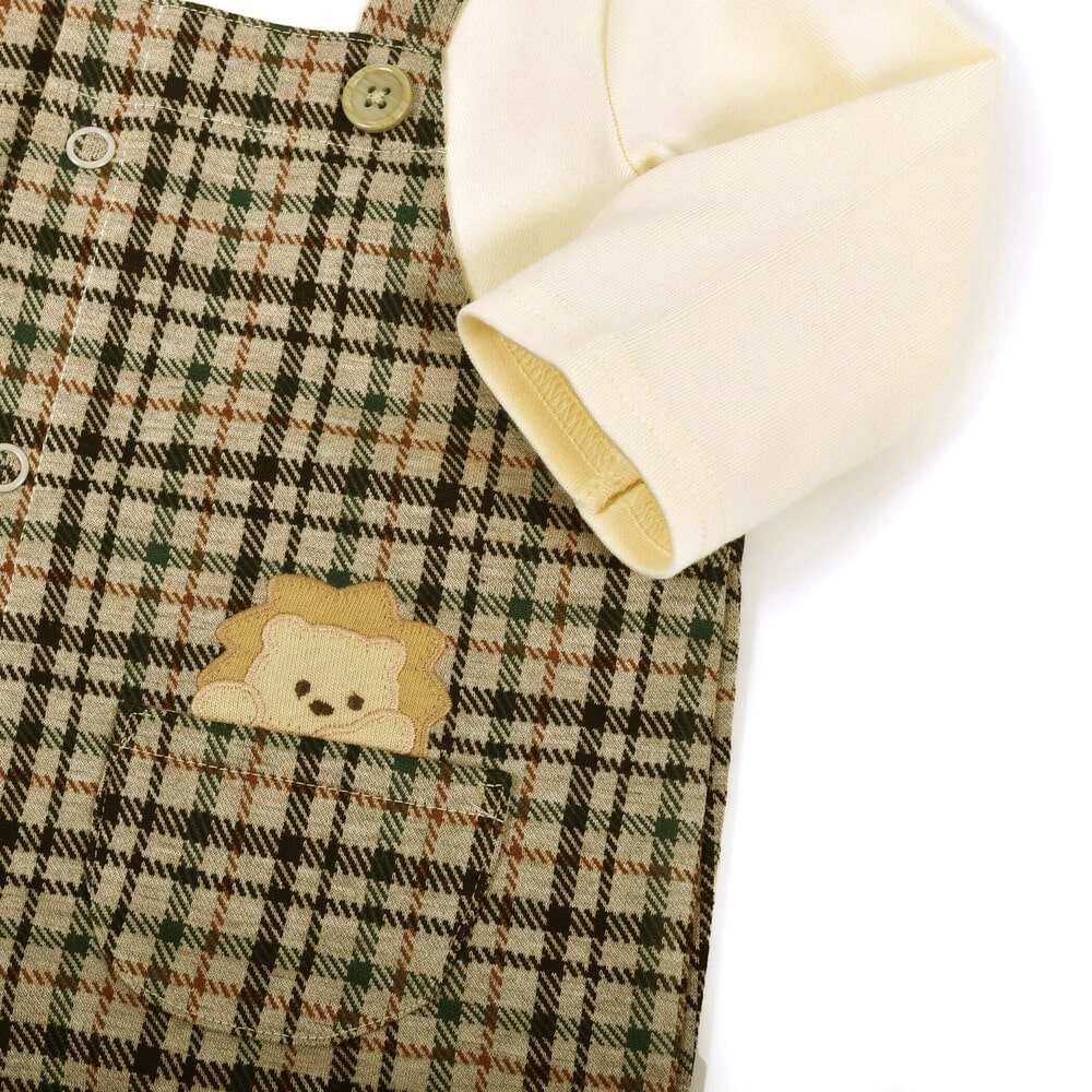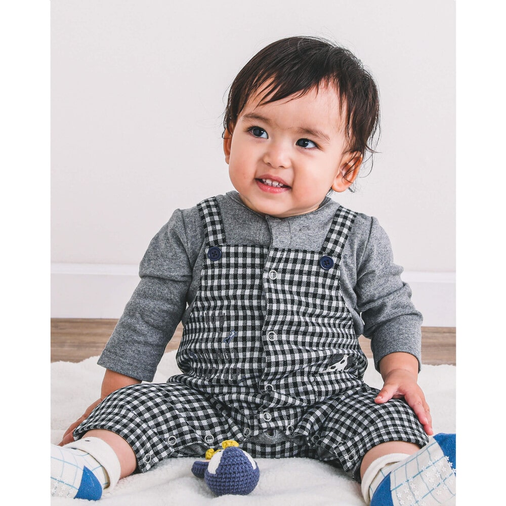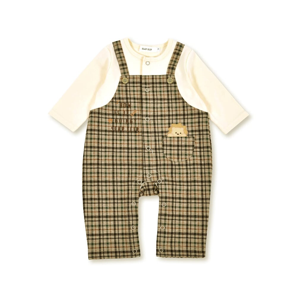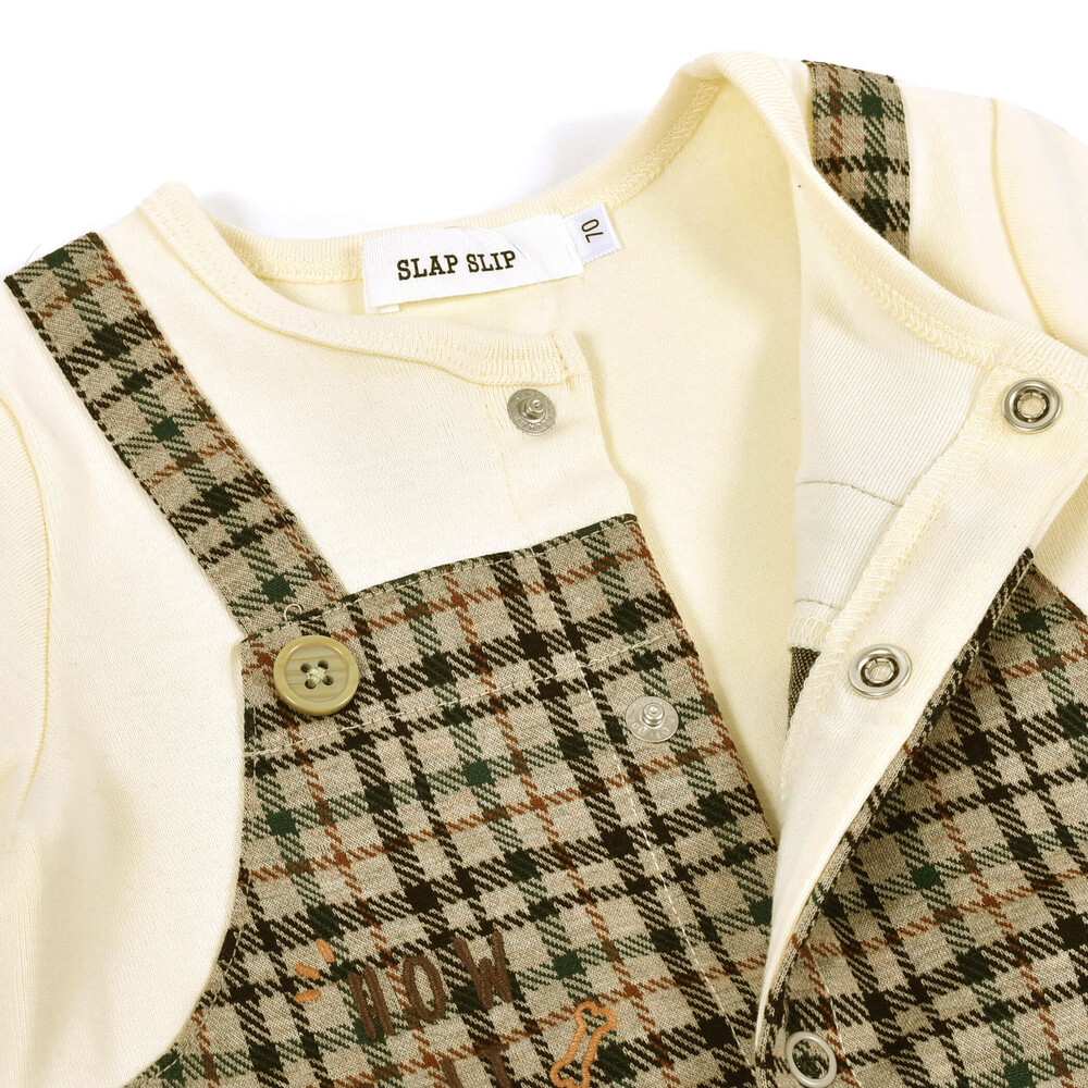 カットソー生地にサロペットをドッキングした、長袖タイプのレイヤード風ロンパース。