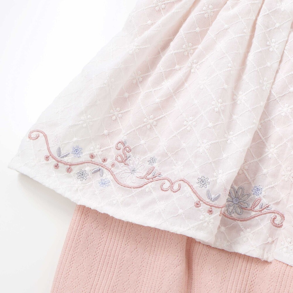 スカートの裾にはお花の刺しゅうがあしらわれた華やかなデザインです。