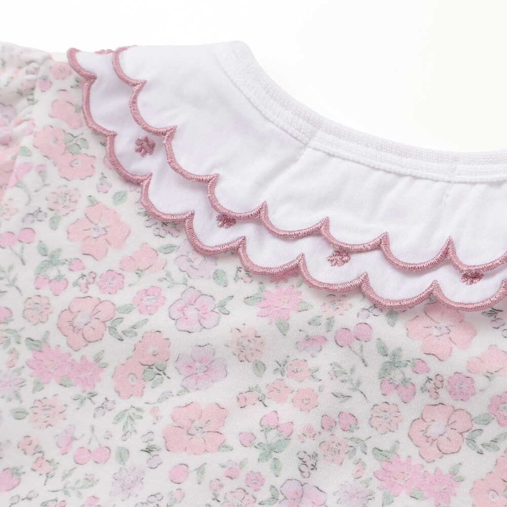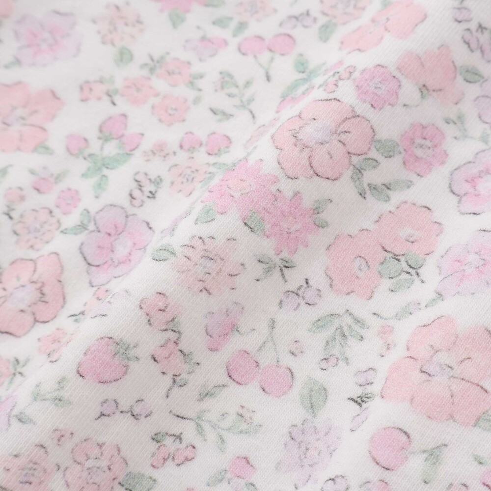 身生地にはやわらかなベア天竺素材を使用し、総柄プリントでぱっと華やかな印象に仕上げました。