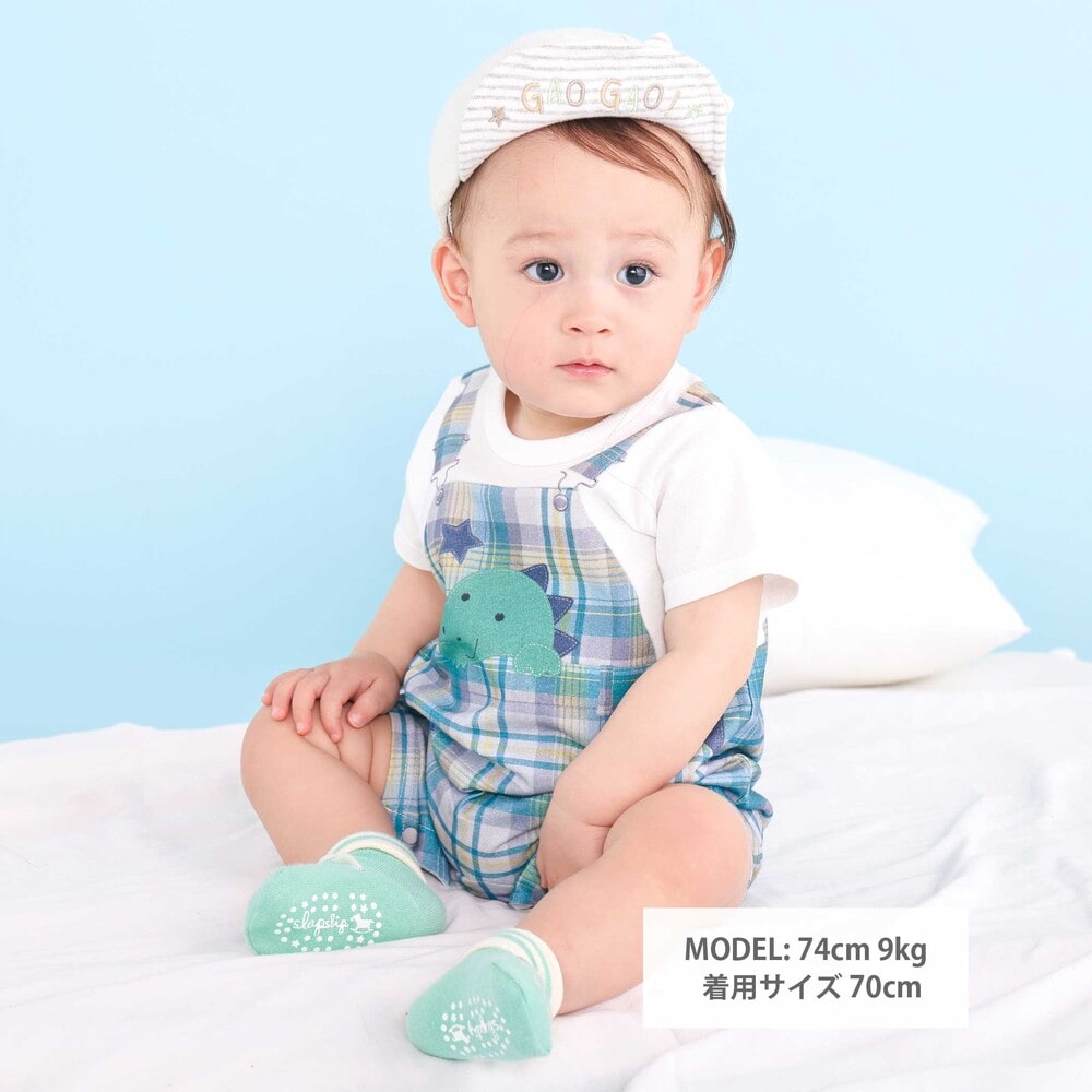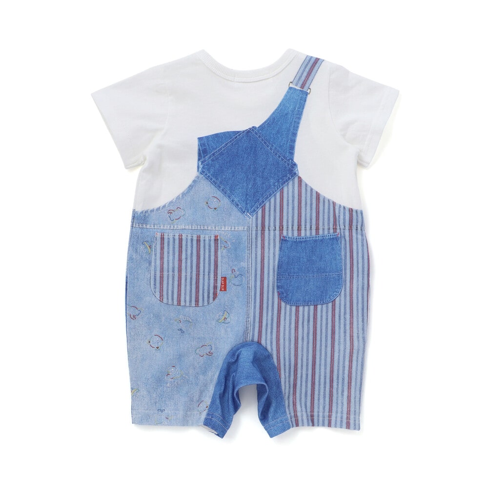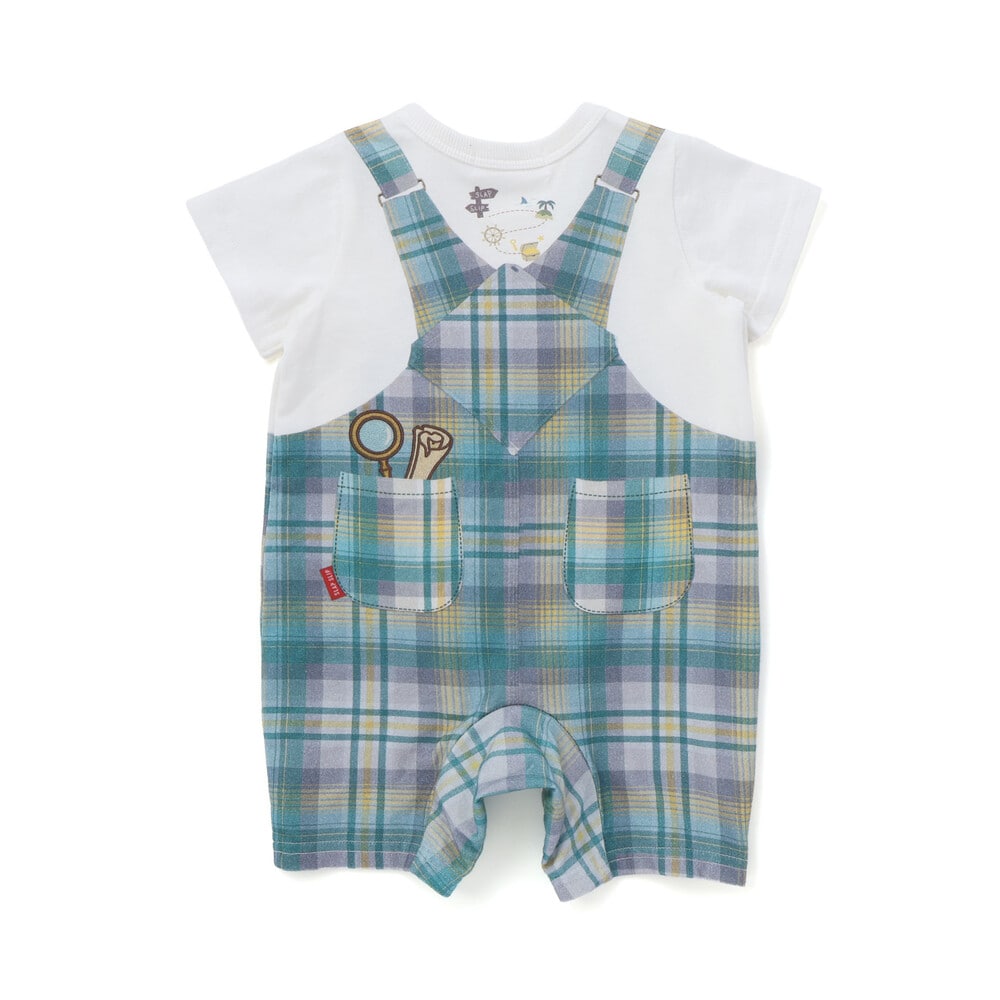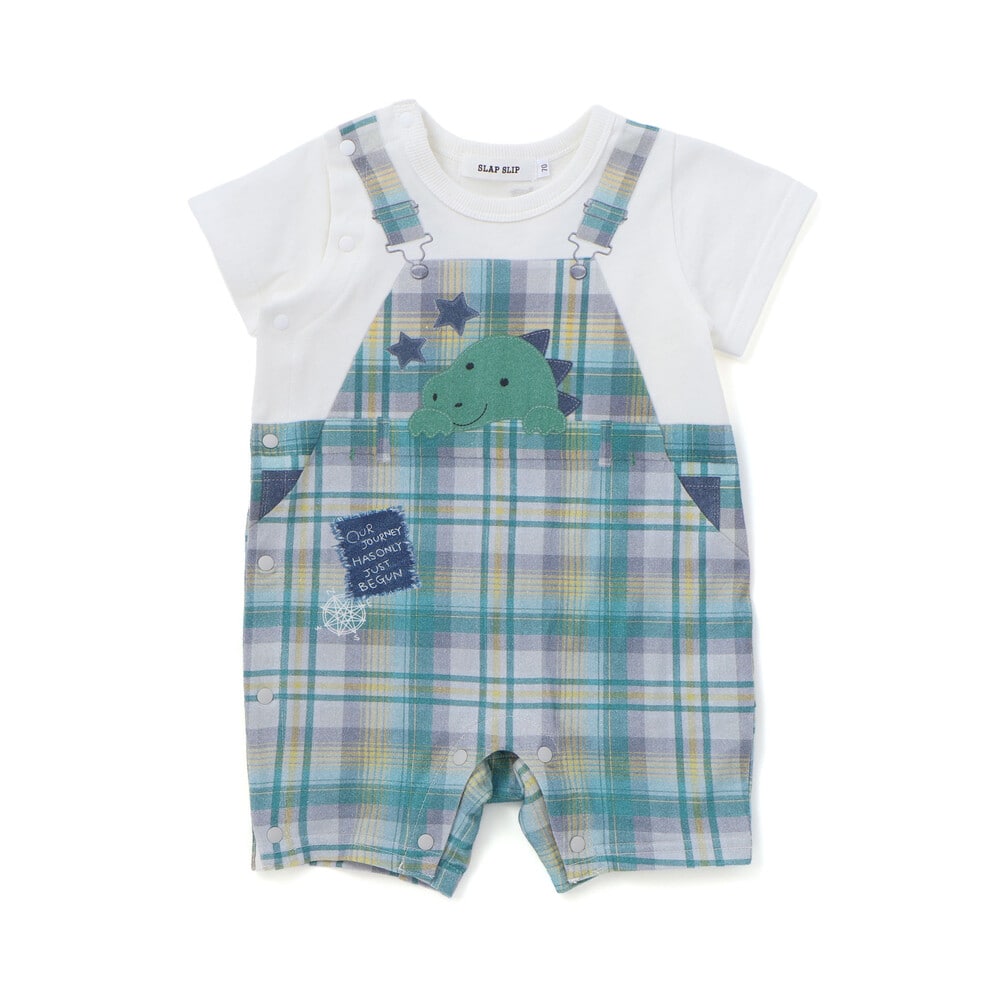 カラーごとにデザインが異なる、男の子ベビー用のサロペット風カバーオール。