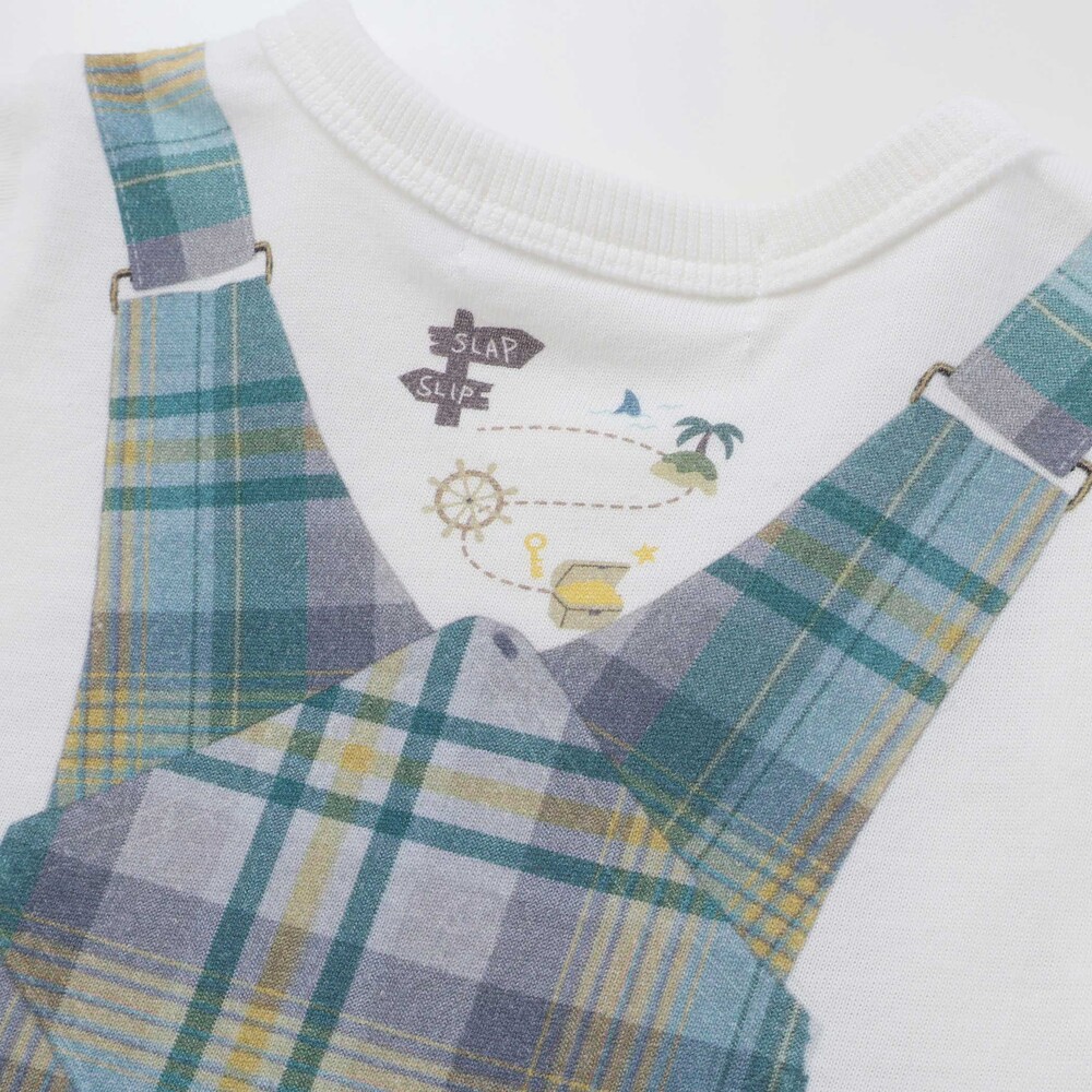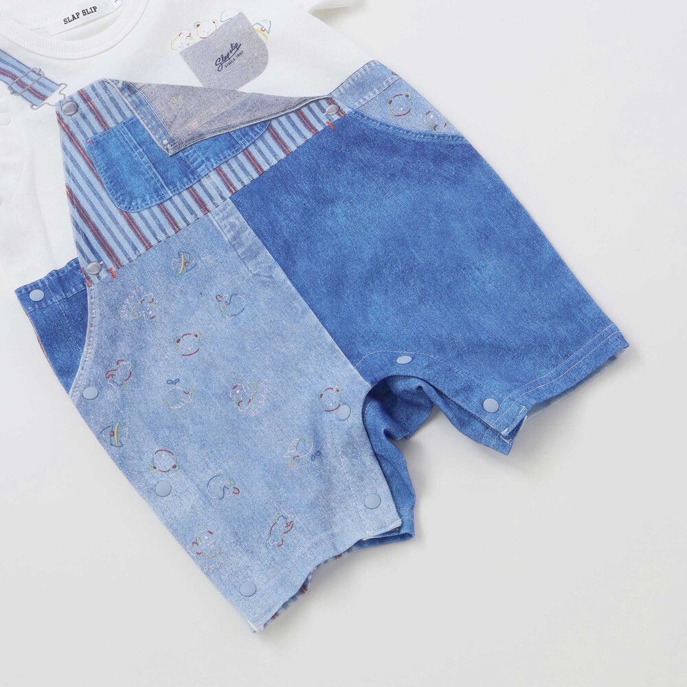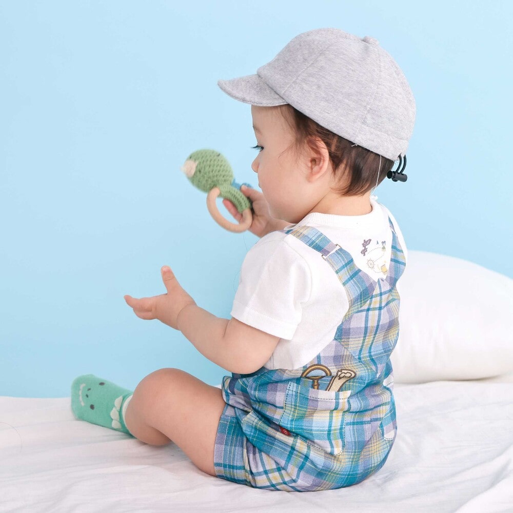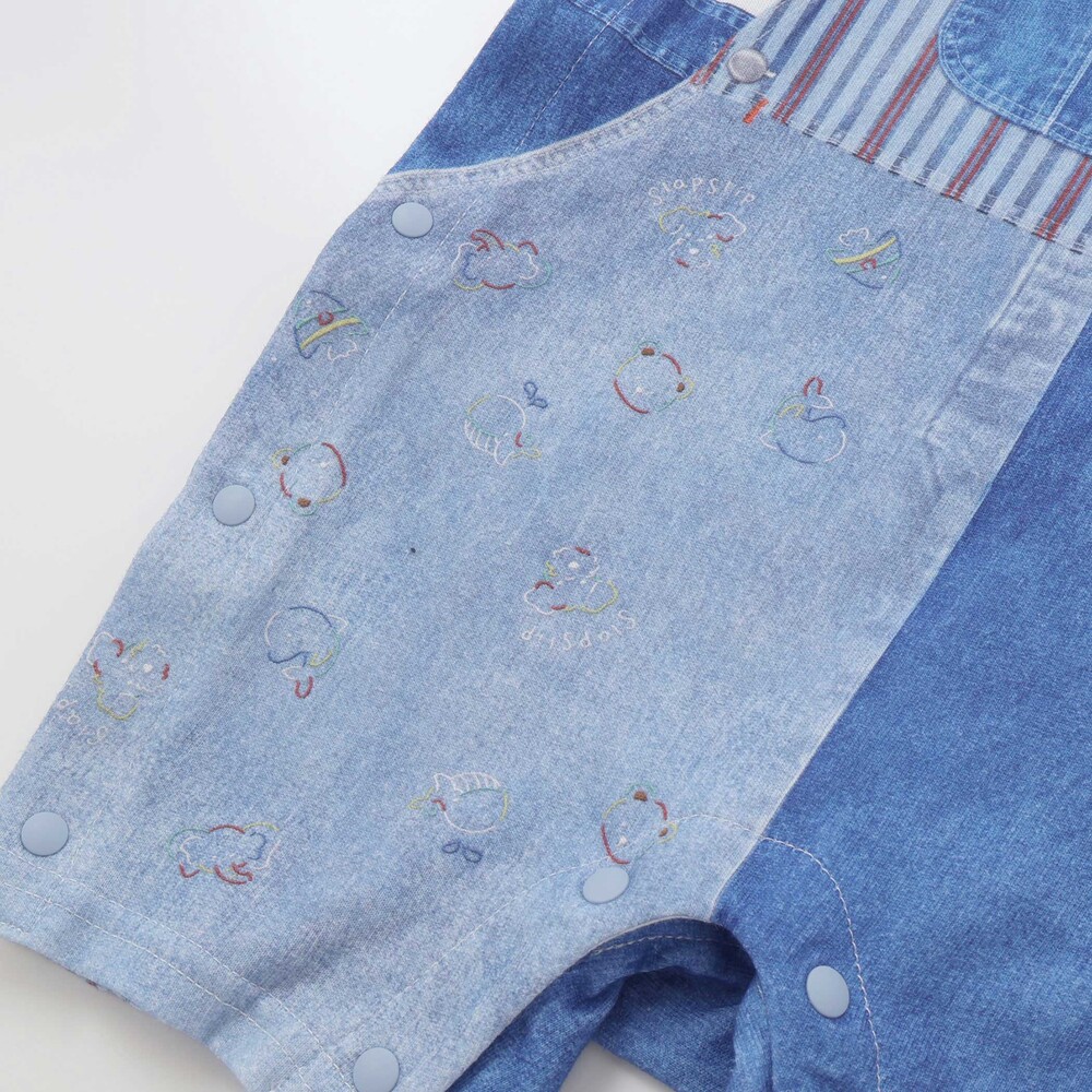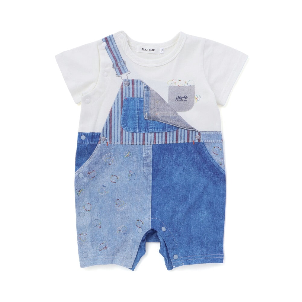 カラーごとにデザインが異なる、男の子ベビー用のサロペット風カバーオール。