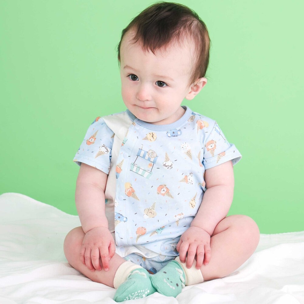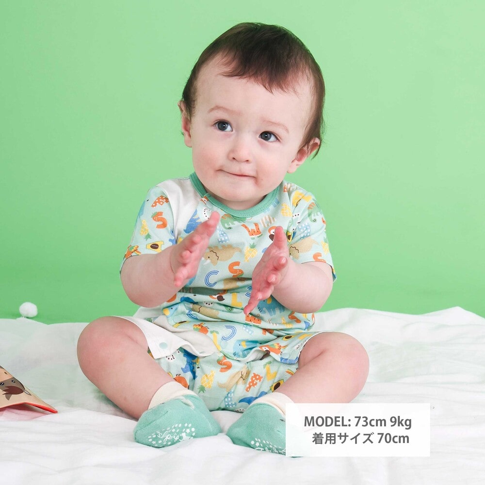 前開きで大きく開き、さらに股下も開く仕様なので、お着替えやオムツ替えもらくらくです。