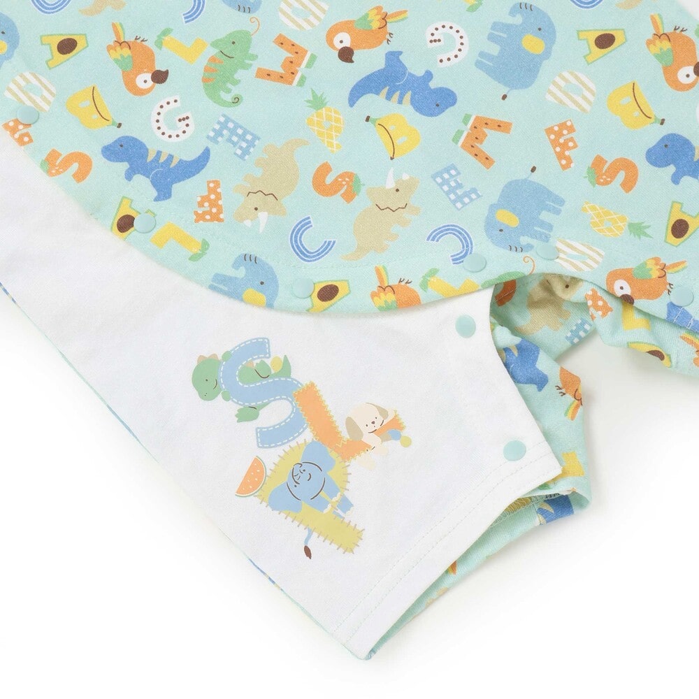 グリーン系は、ゾウや恐竜、オウムにアルファベットを組み合わせた、わくわく感あふれる楽しい総柄です。