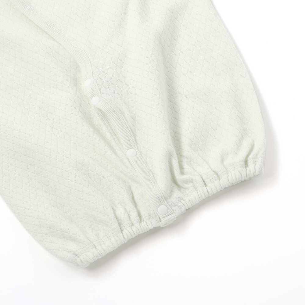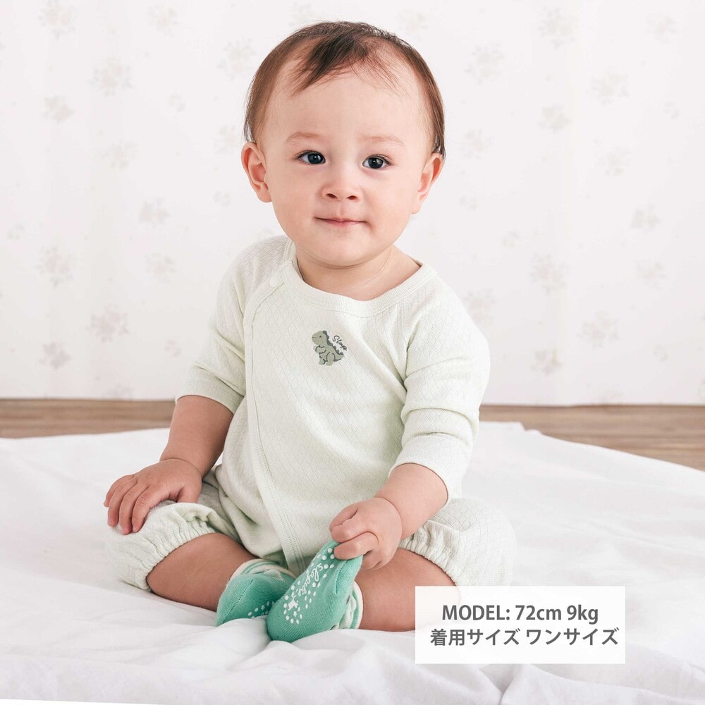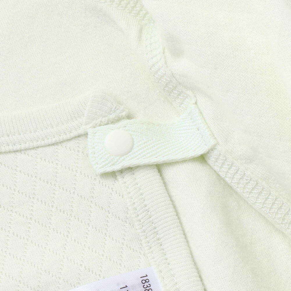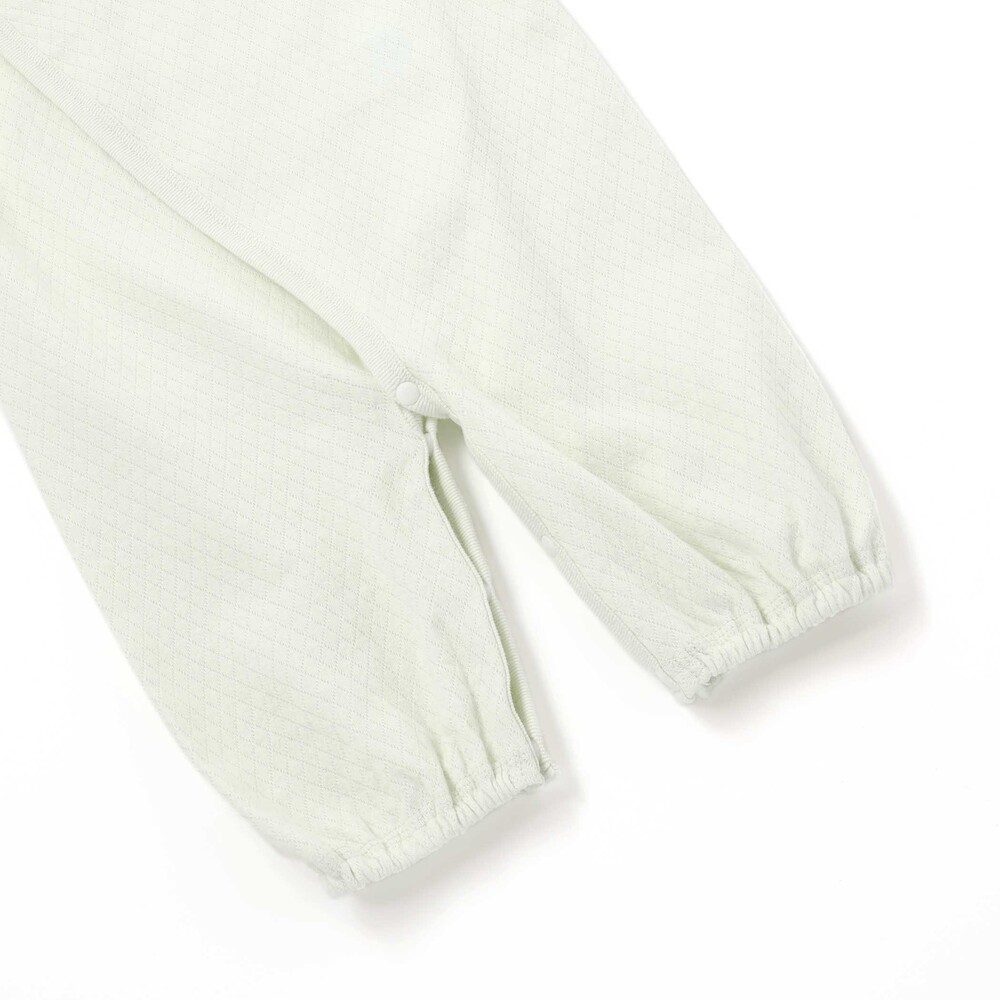 股下にはスナップが付いていて、足をバタバタしてもはだけにくく、オムツ替えもラクラクな設計です。