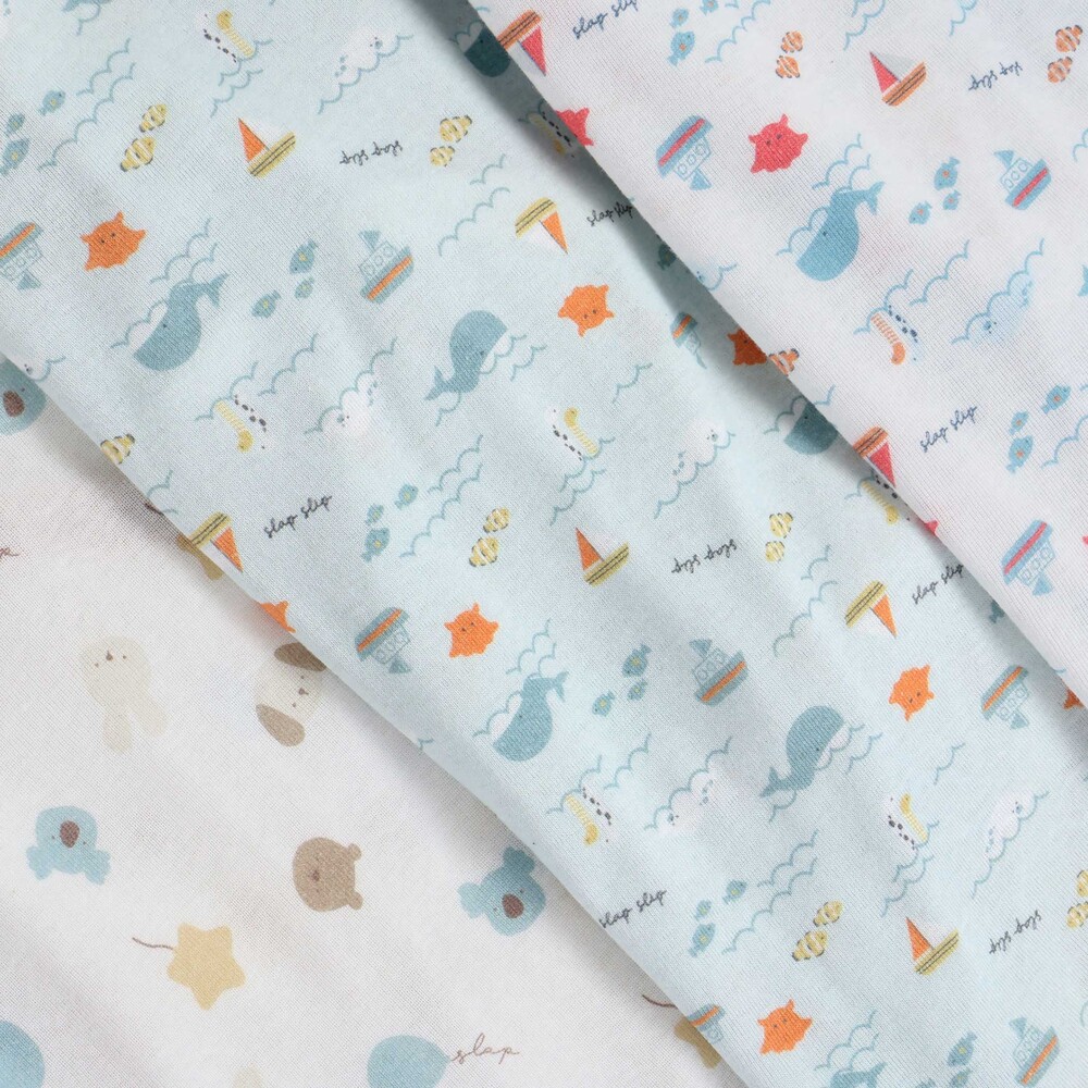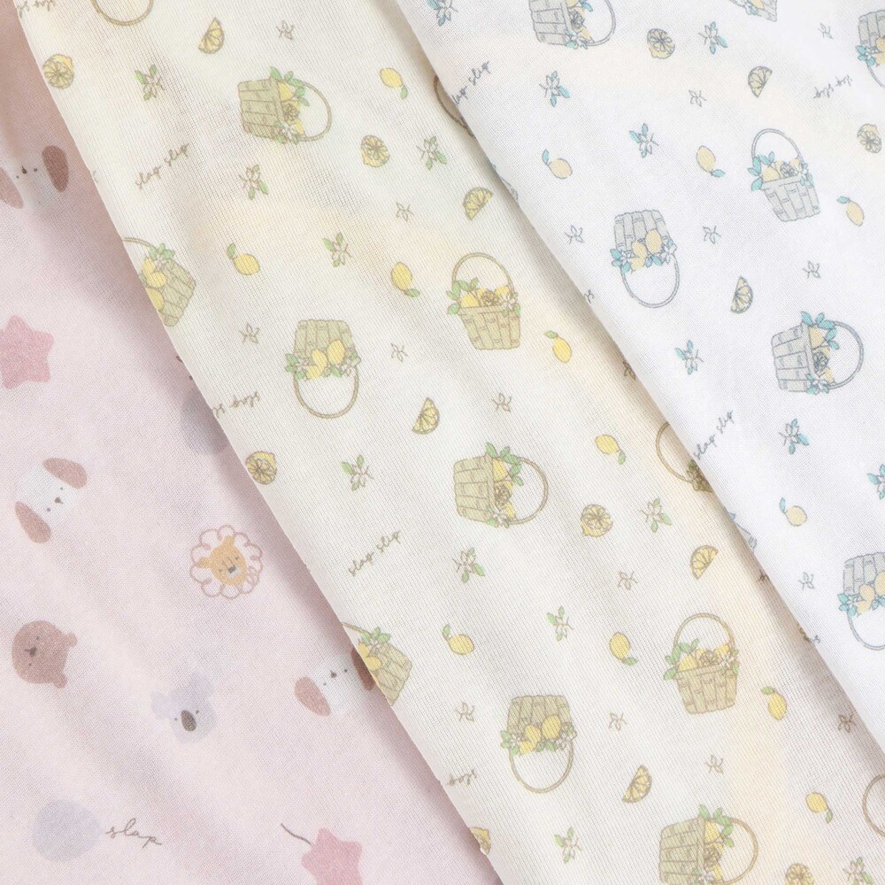 ホワイト系とブルー系には海の生き物がのびのびと泳ぐデザインを、イエロー系とオフホワイト系にはレモンがころんと描かれた爽やかな柄を、そしてピンク系とベージュ系にはほっこり可愛いアニマル柄をあしらいました。