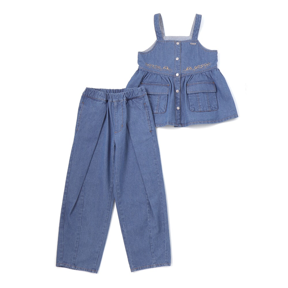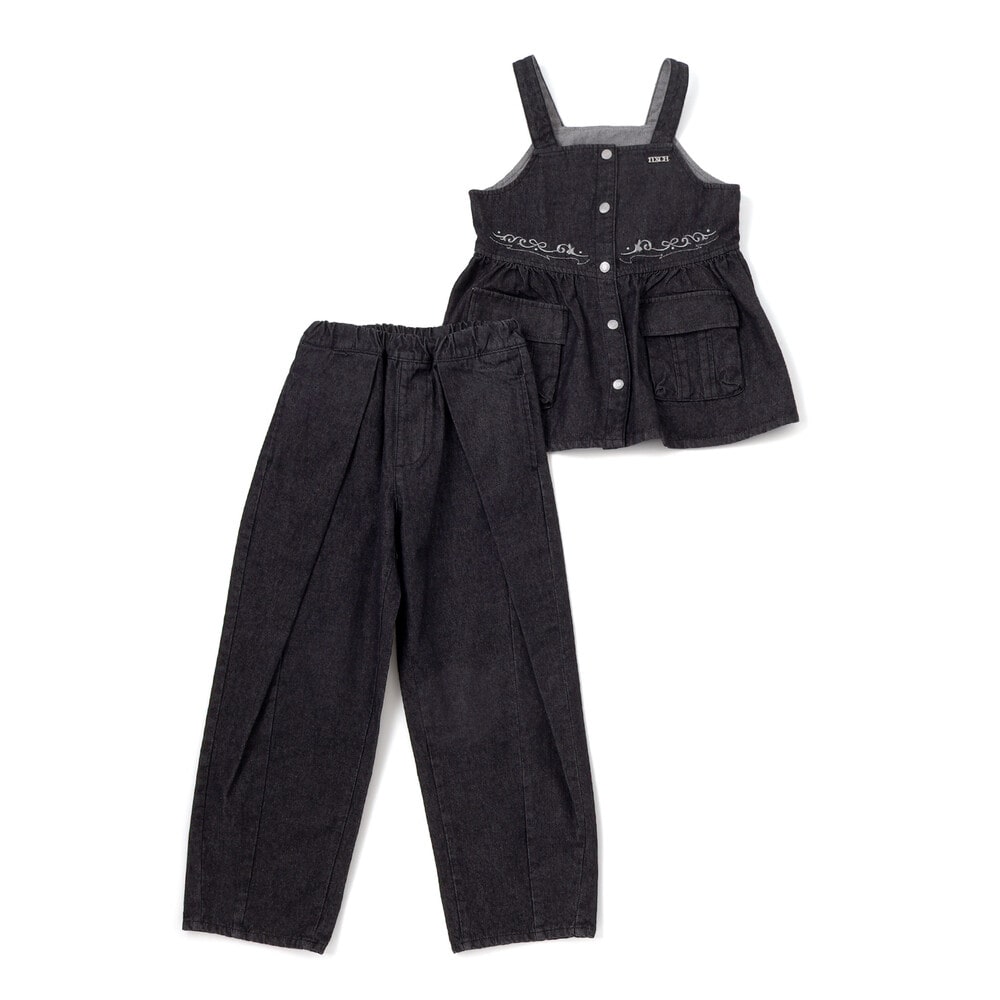 甘さとカジュアルを両立したビスチェと太パンツのセットアップ。