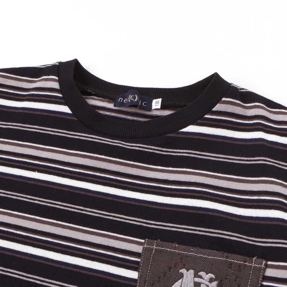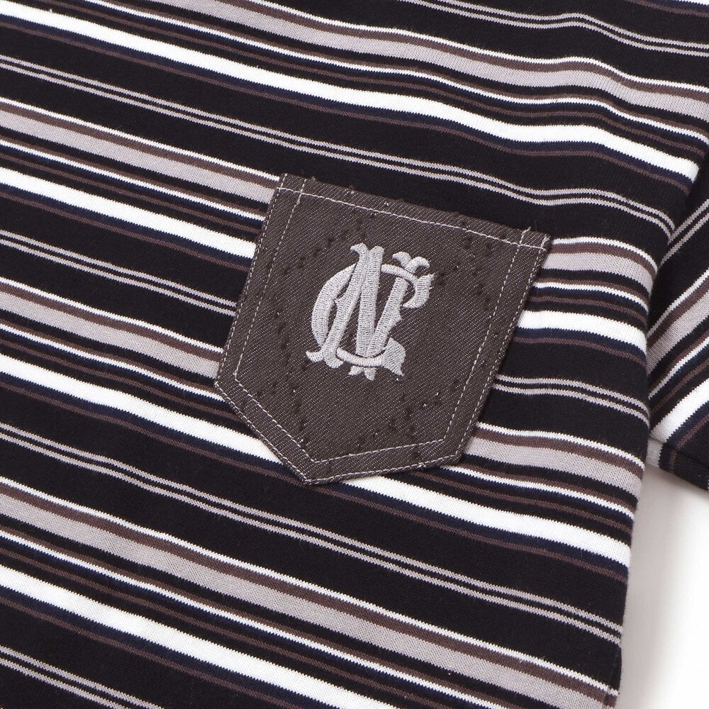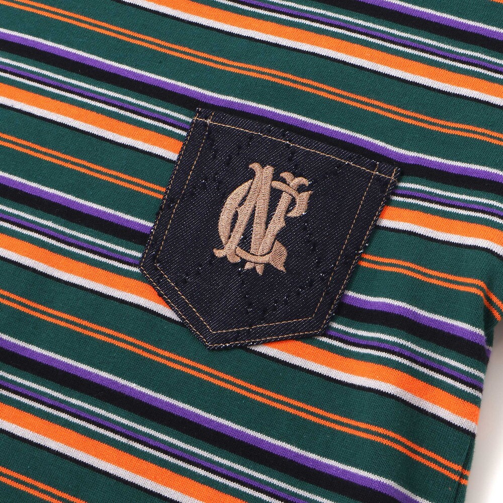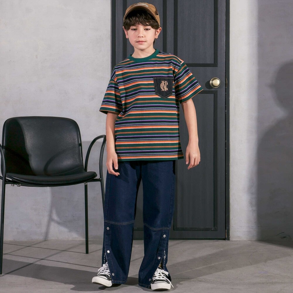 左胸に刺しゅう入りのデニムポケットが付いたボーダー柄の半袖シャツのセットアイテム。