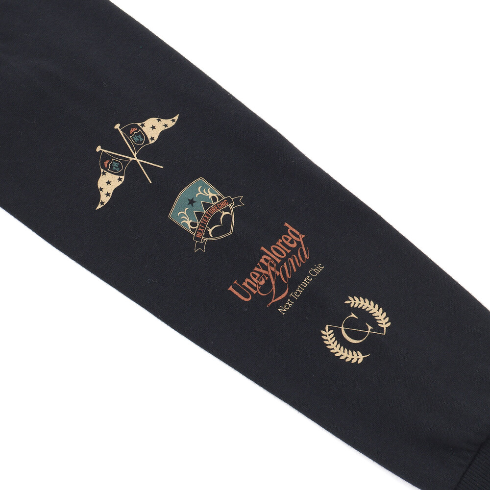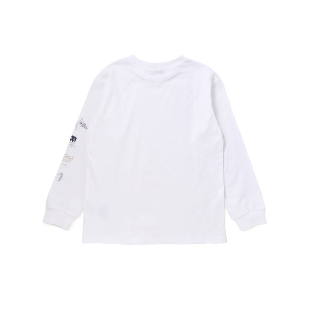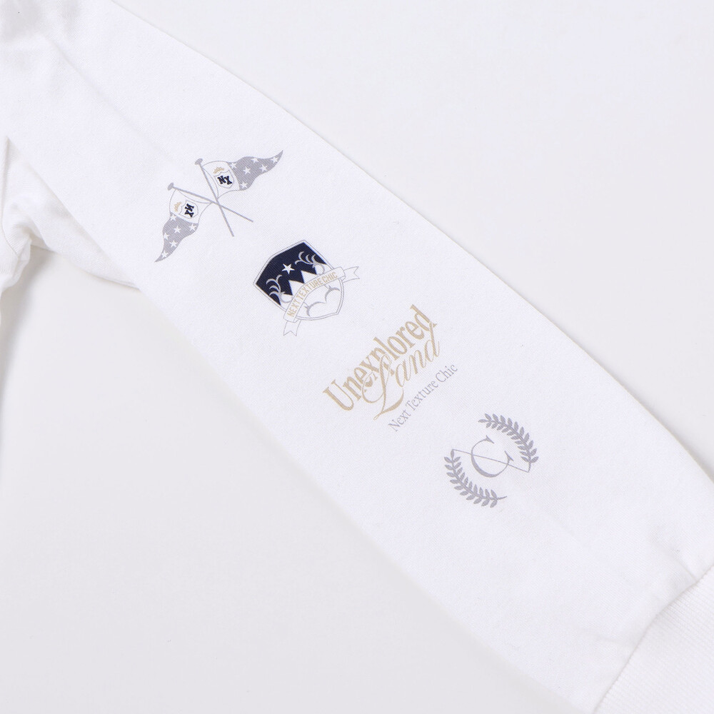 左腕に旗やエンブレムなどのロゴプリントが施された長袖シャツと、