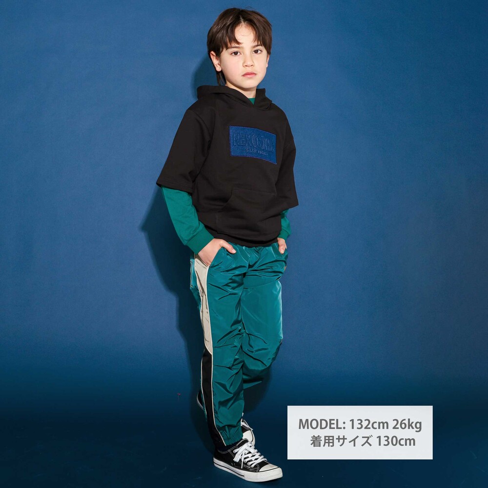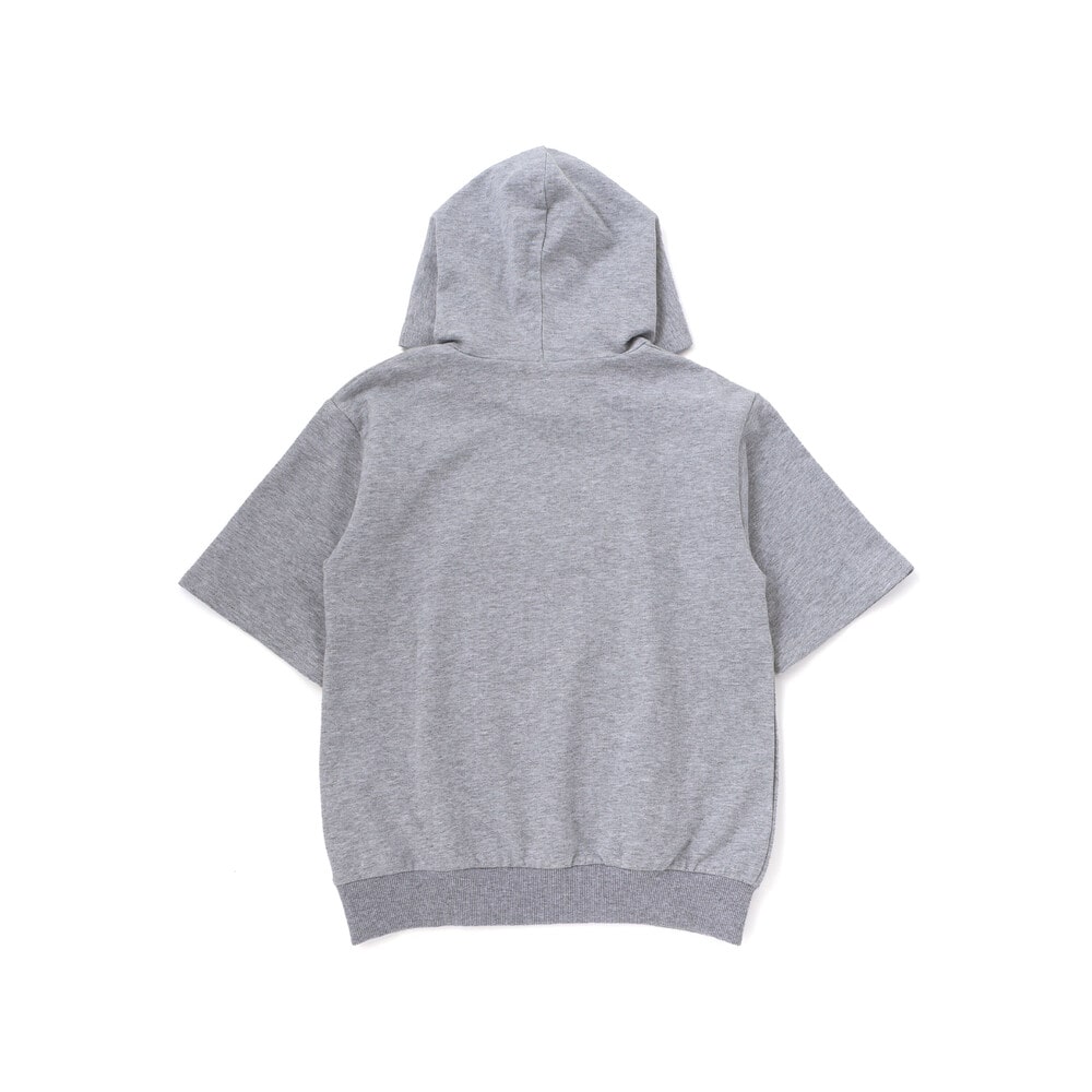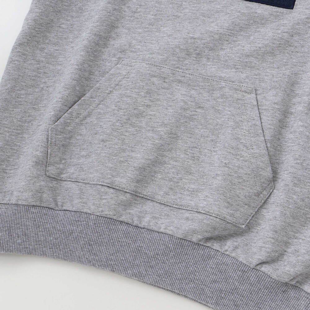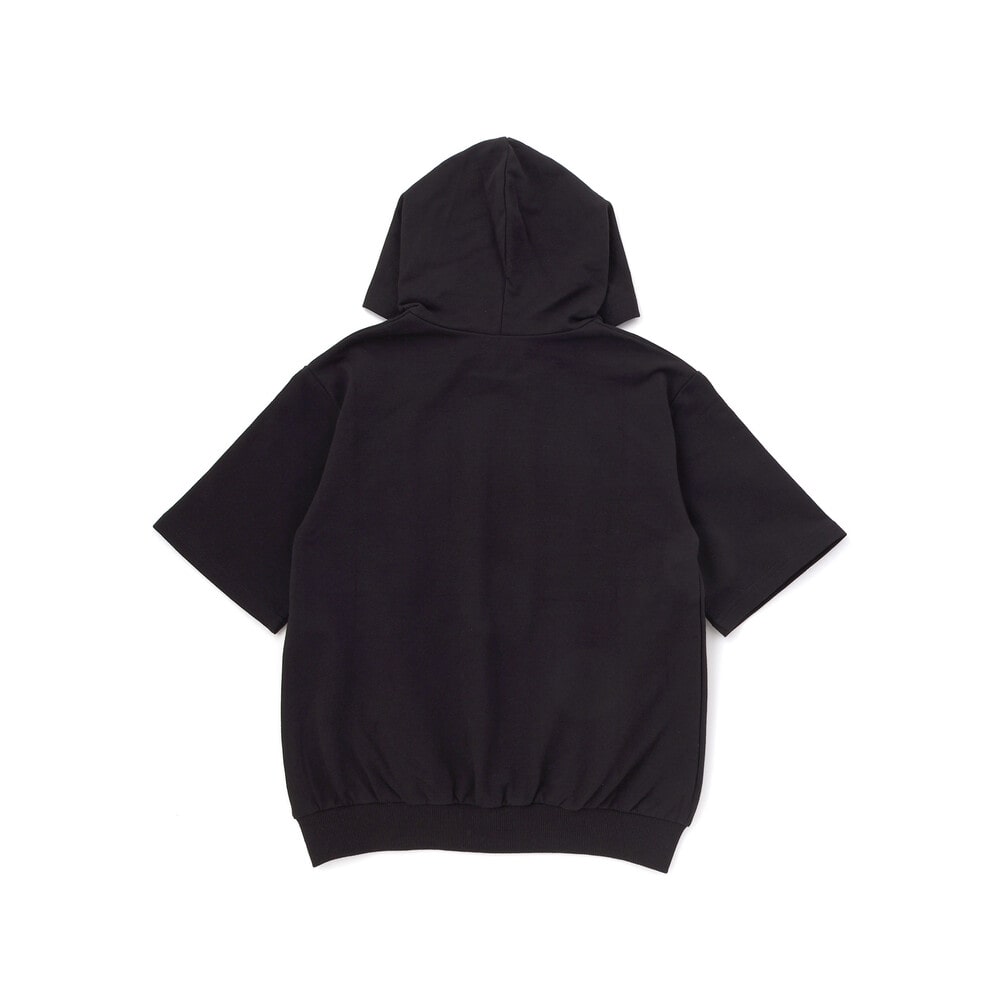半袖パーカーはミニウラゲ素材で、フロントにパッチと刺しゅうをあしらい、カンガルーポケット付きでカジュアルな雰囲気に。