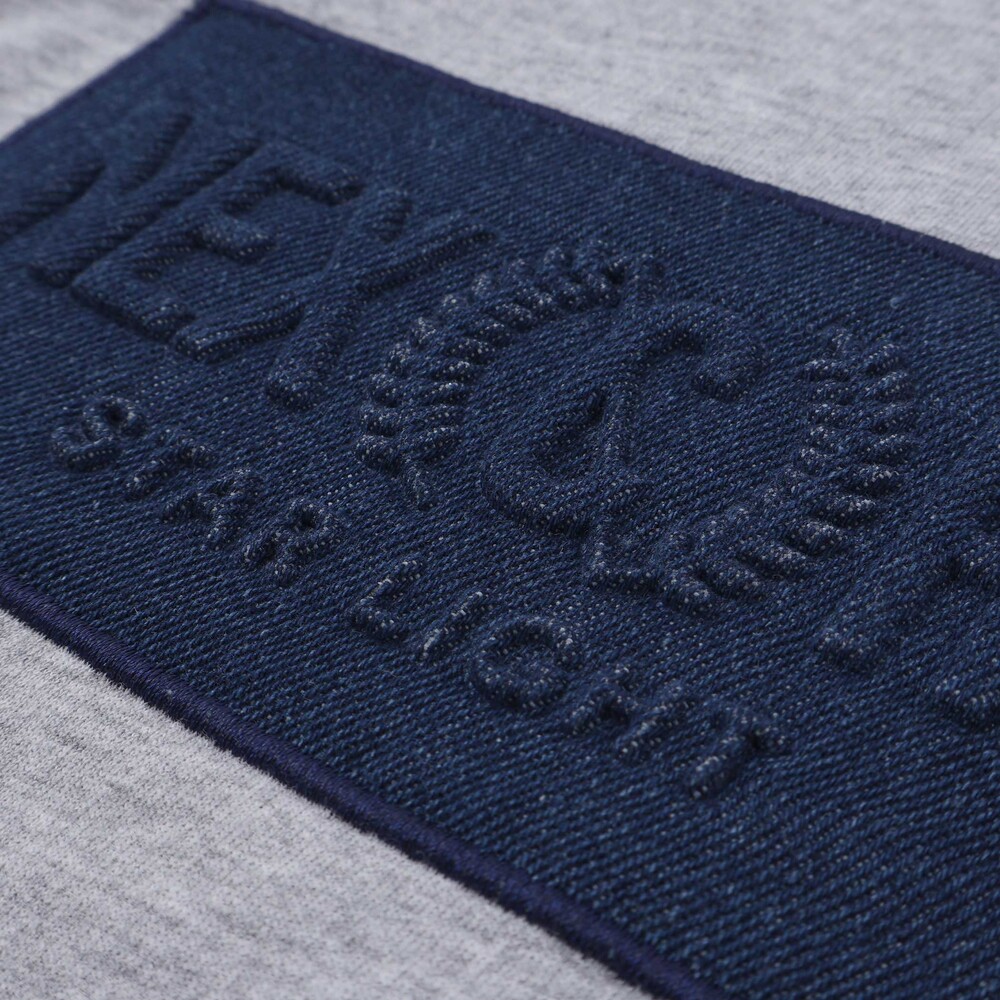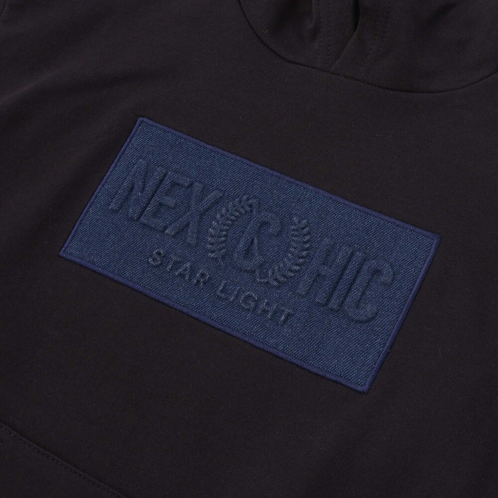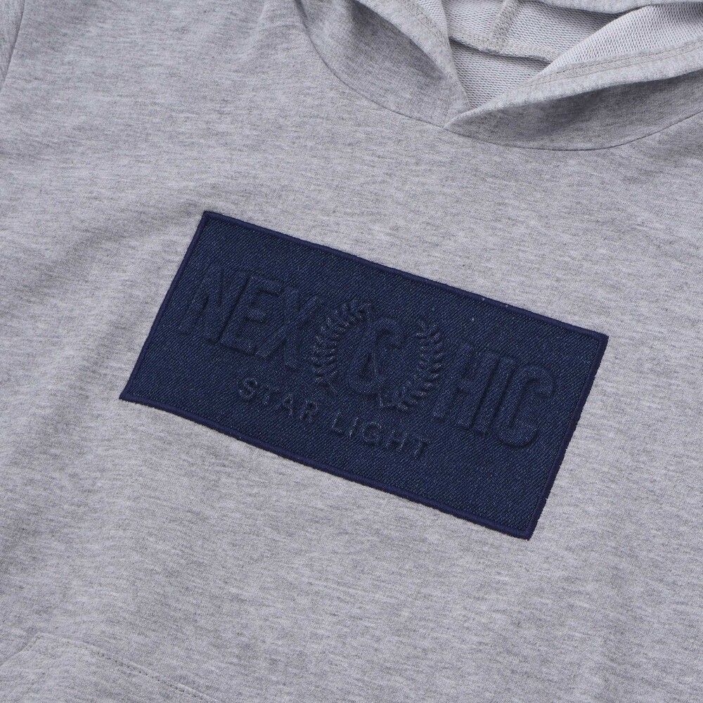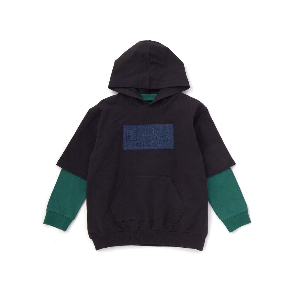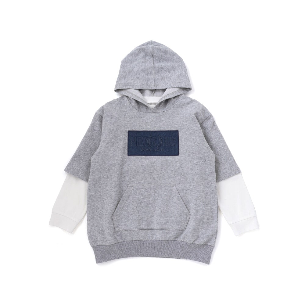 半袖パーカーはミニウラゲ素材で、フロントにパッチと刺しゅうをあしらい、カンガルーポケット付きでカジュアルな雰囲気に。