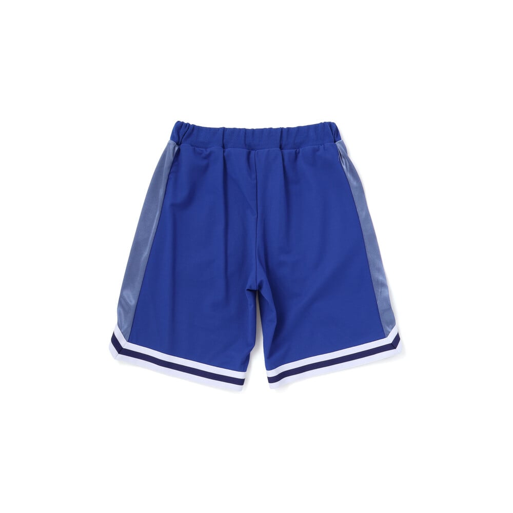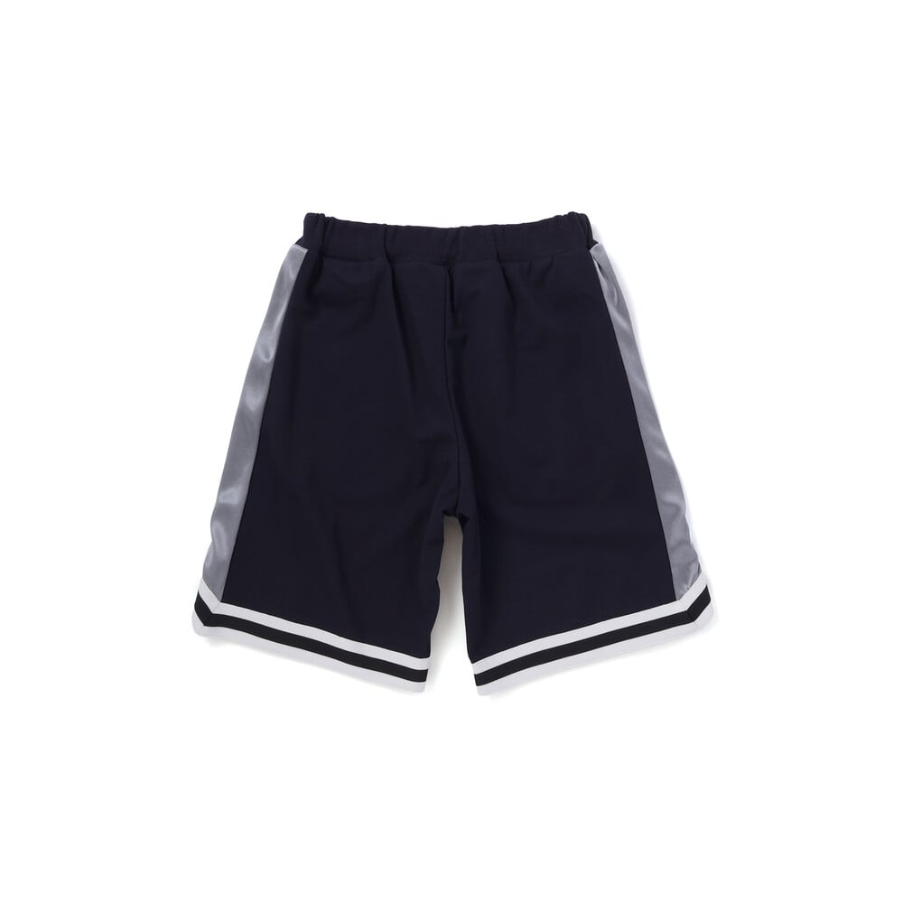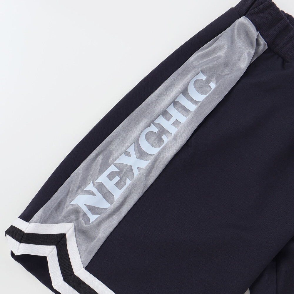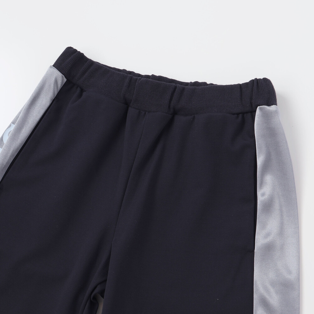 パンツはサイドをサテン生地で切り替え、裾にはトップスとお揃いの2本ラインを配置。