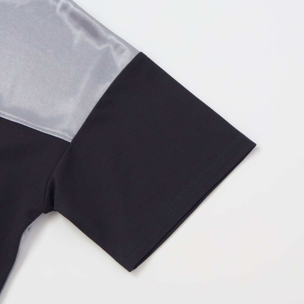 前ヨークや後ろ脇身頃をサテン生地で切り替えることで、動くたびに光を反射する都会的なデザインです。