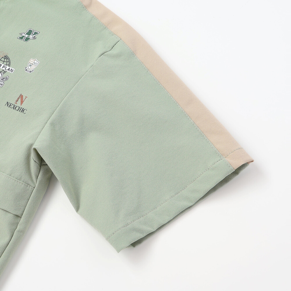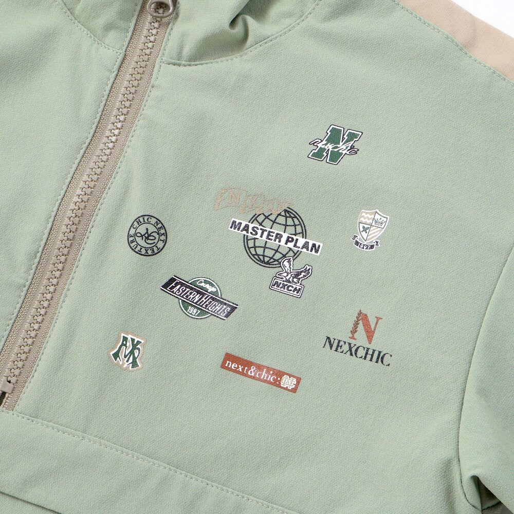 両胸にそれぞれ異なるNEXCHICのロゴプリントを施した、アシンメトリーで存在感のあるデザインです。