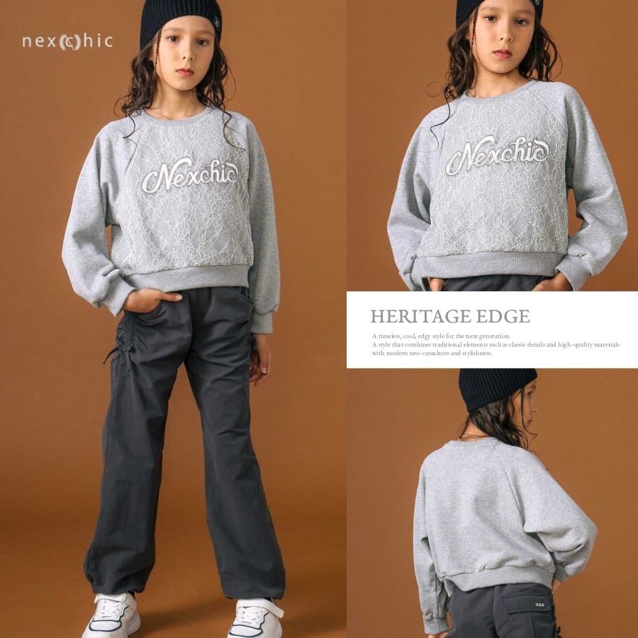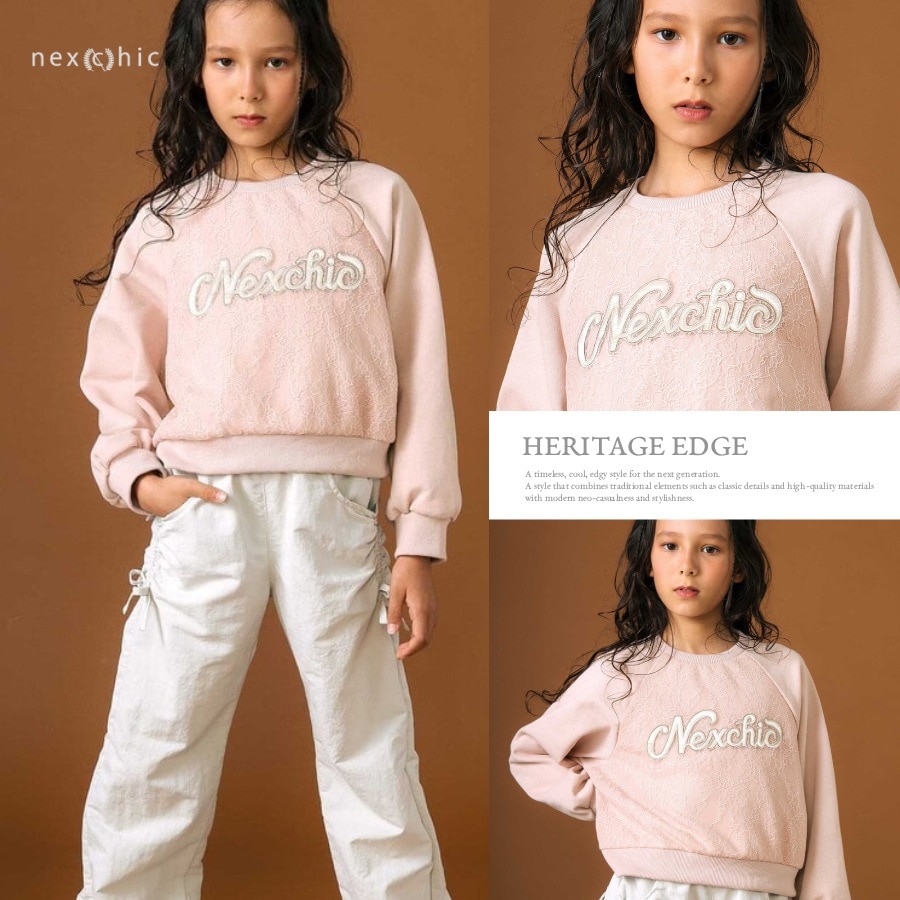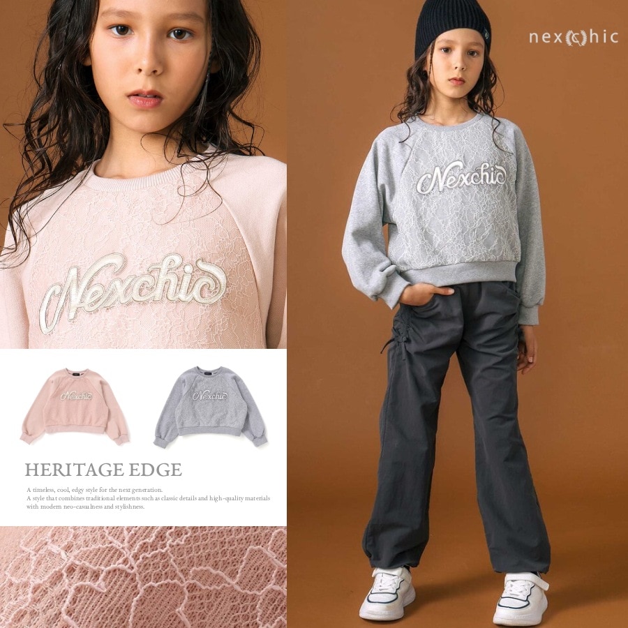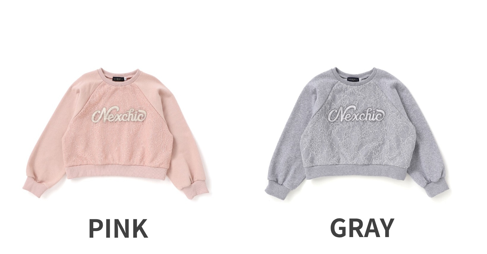 ロゴ刺しゅうにレースがついた女の子用裏毛トレーナー。