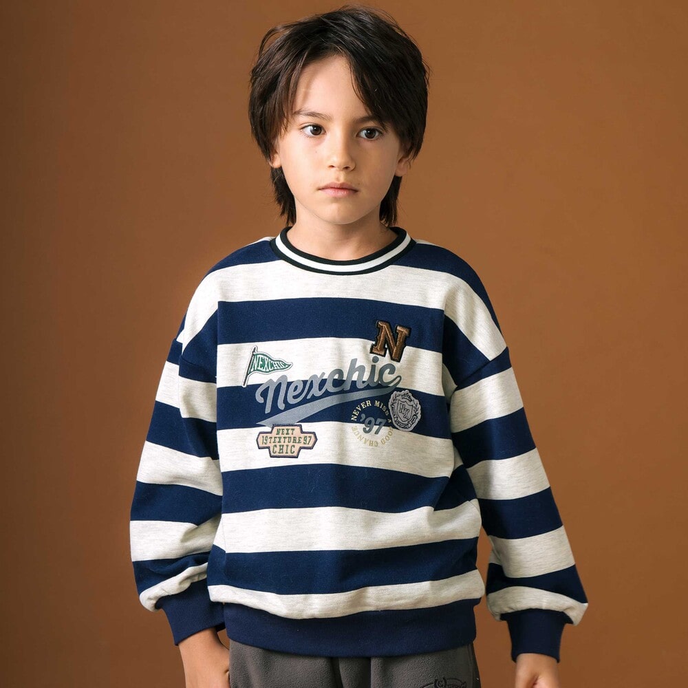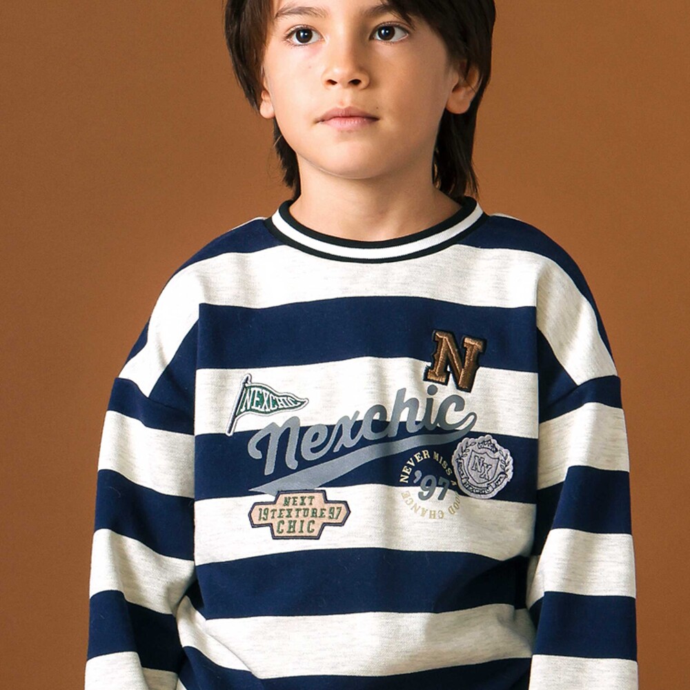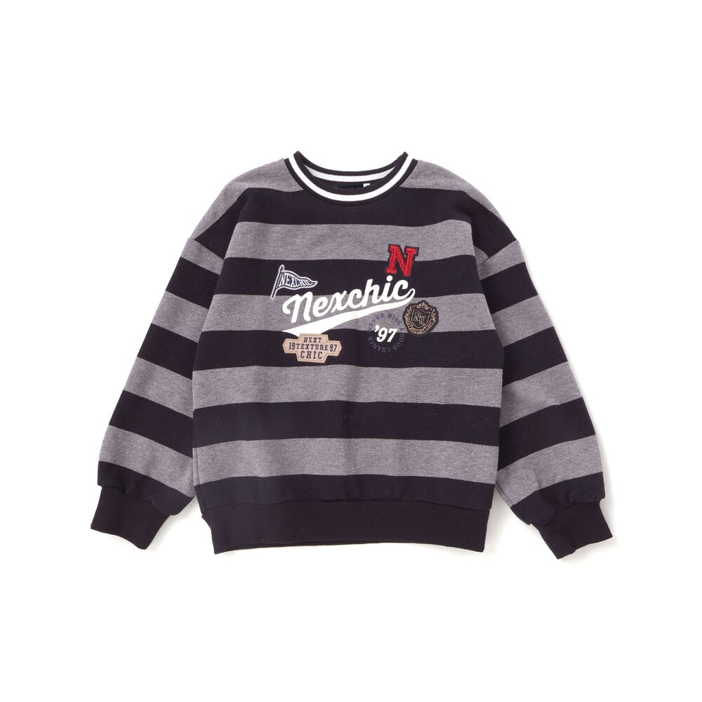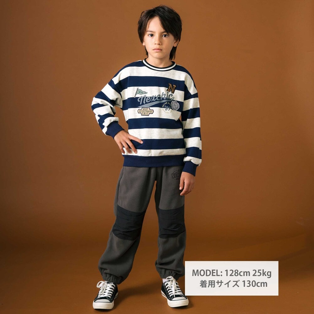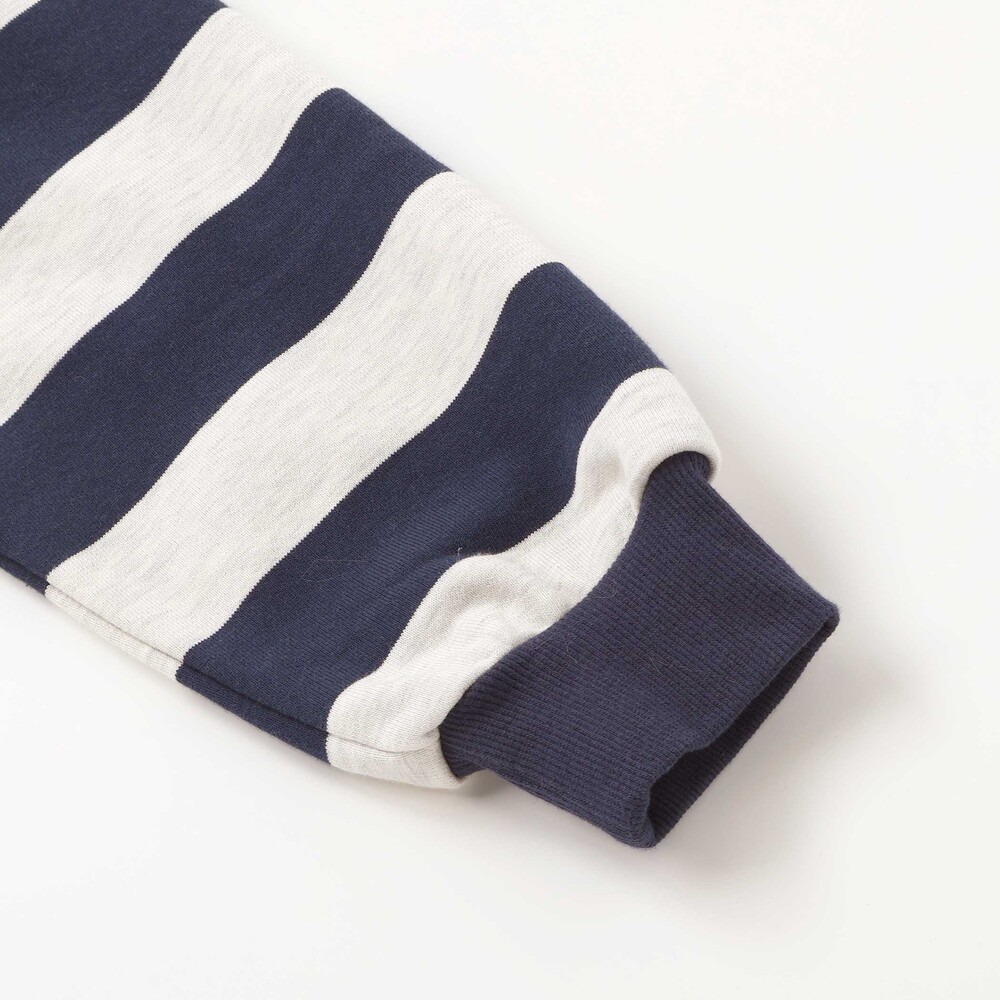 カジュアルな印象のボーダー柄裏毛素材を使用した、着心地の良い男の子用トレーナー。