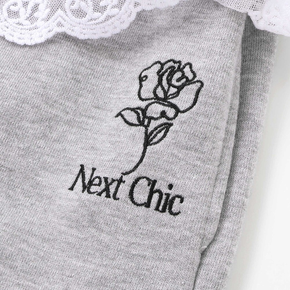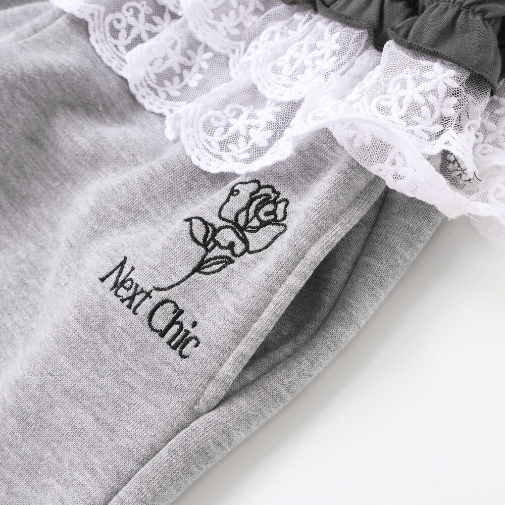 左前のフリル下にはバラとロゴ刺しゅうが施され、さりげないアクセントに。