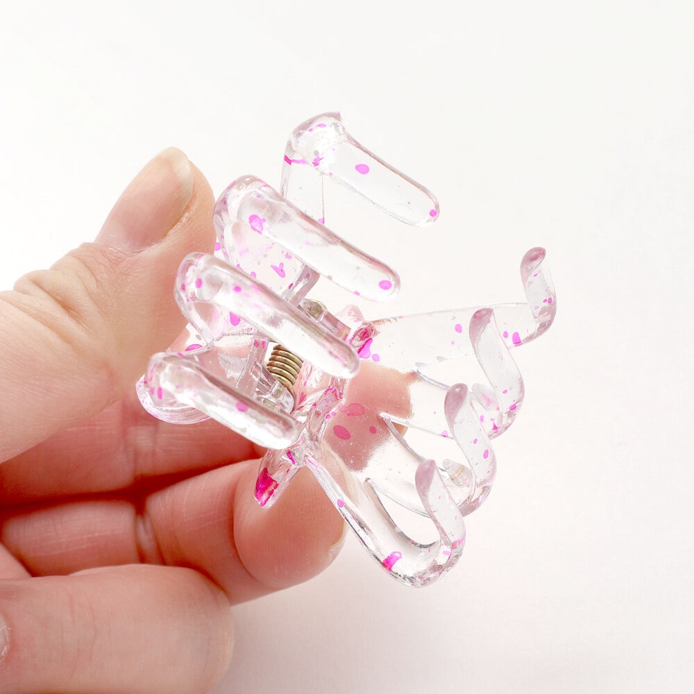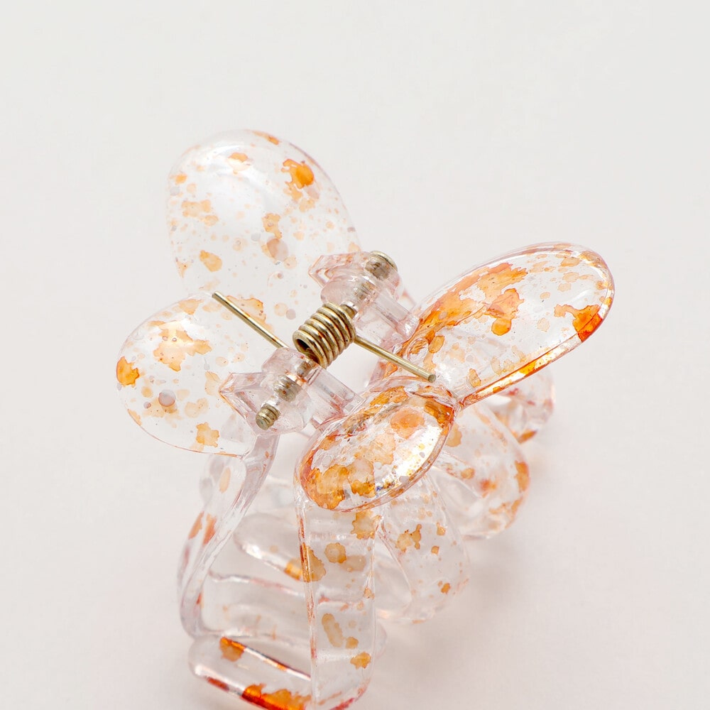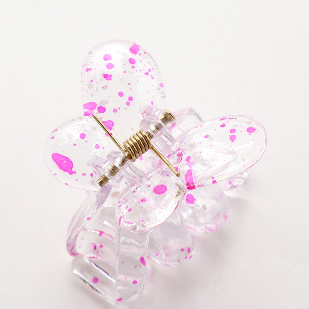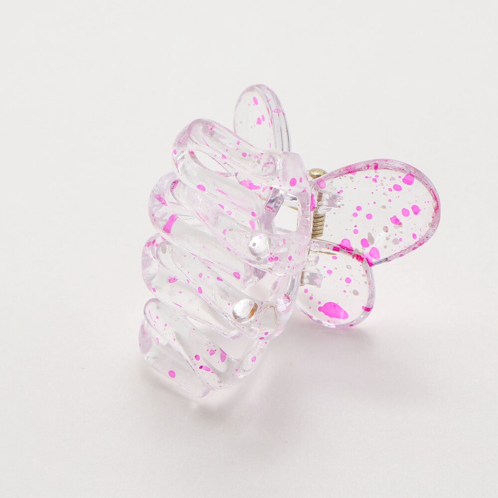 透き通るクリア素材に、ペンキを飛ばしたようなスプラッシュ柄が映える、遊び心たっぷりのバタフライ型ヘアクリップです。