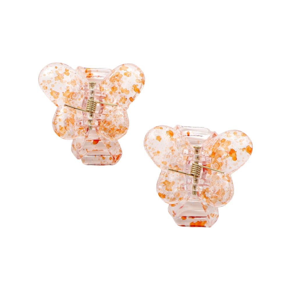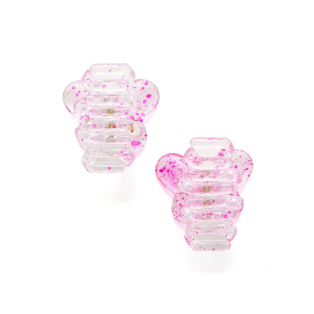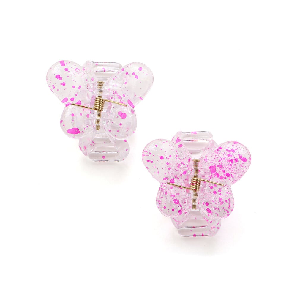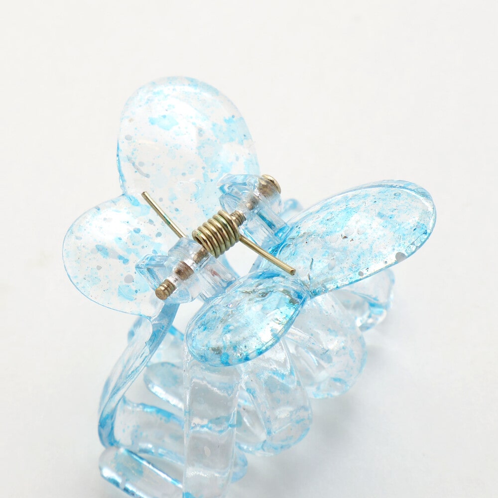 透き通るクリア素材に、ペンキを飛ばしたようなスプラッシュ柄が映える、遊び心たっぷりのバタフライ型ヘアクリップです。