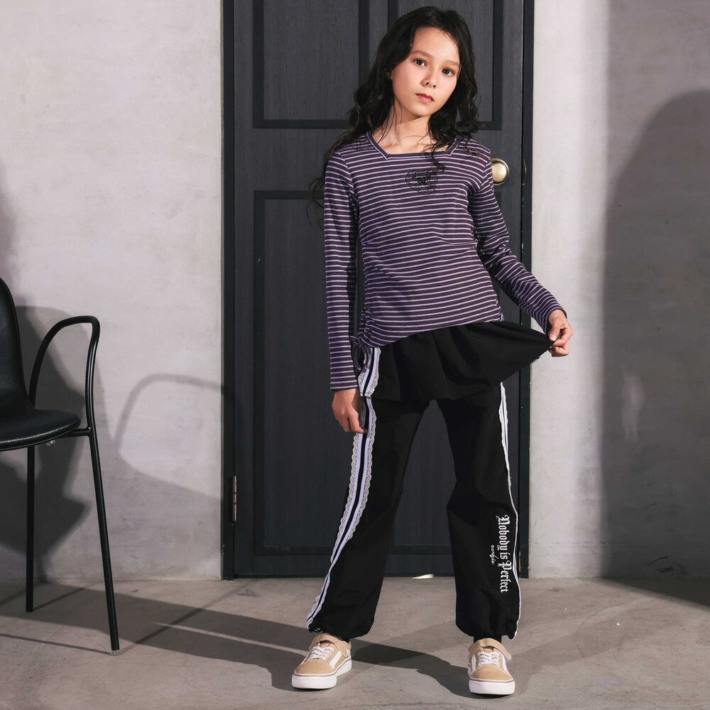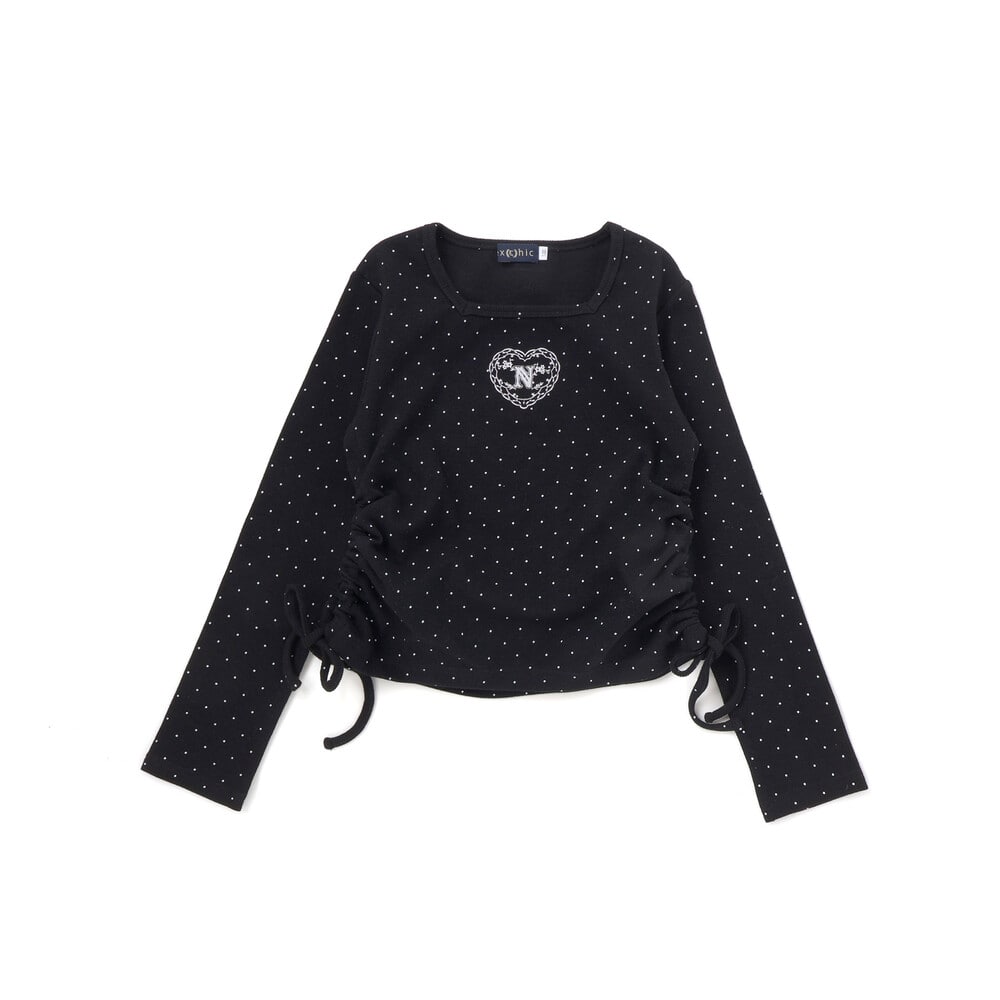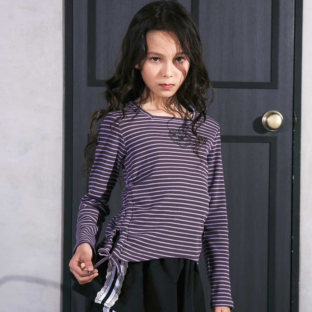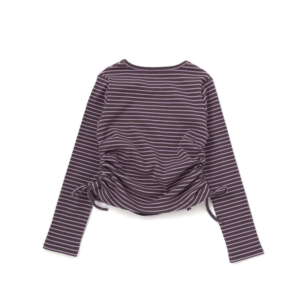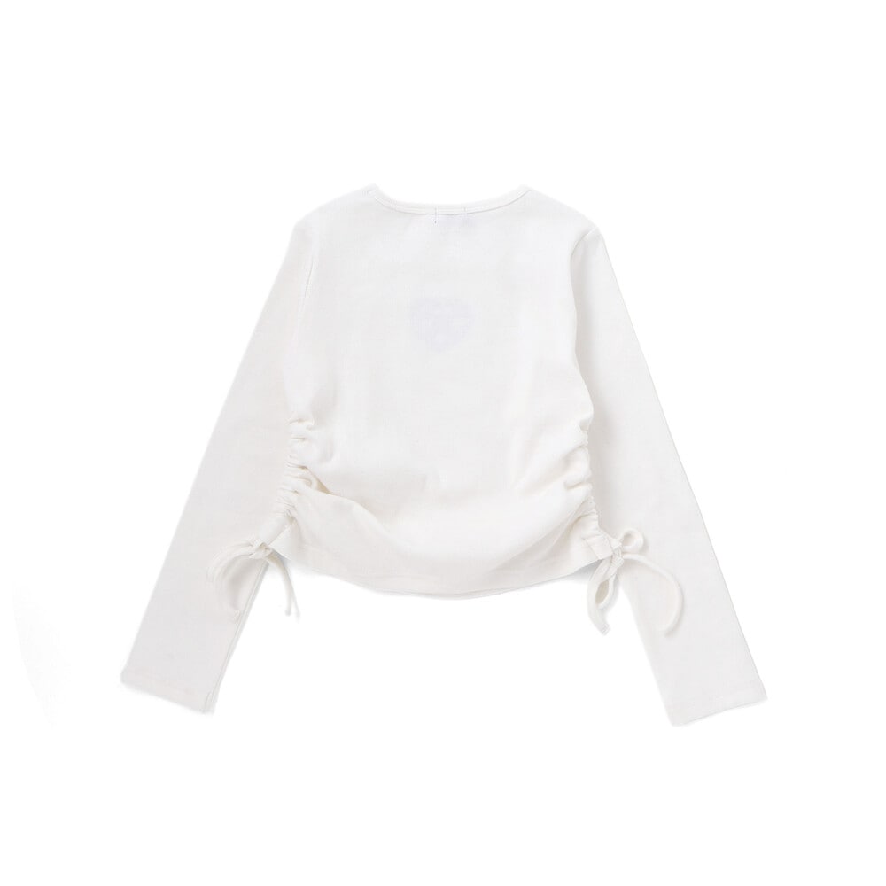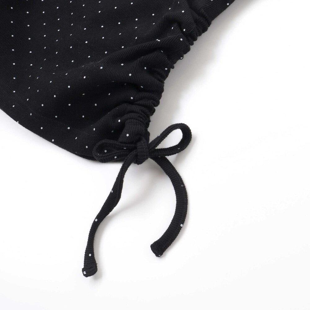 裾のサイドにスリットがあり、紐をリボン結びにすることでギャザーが寄り、ふんわりとしたガーリーなシルエットを演出できます。