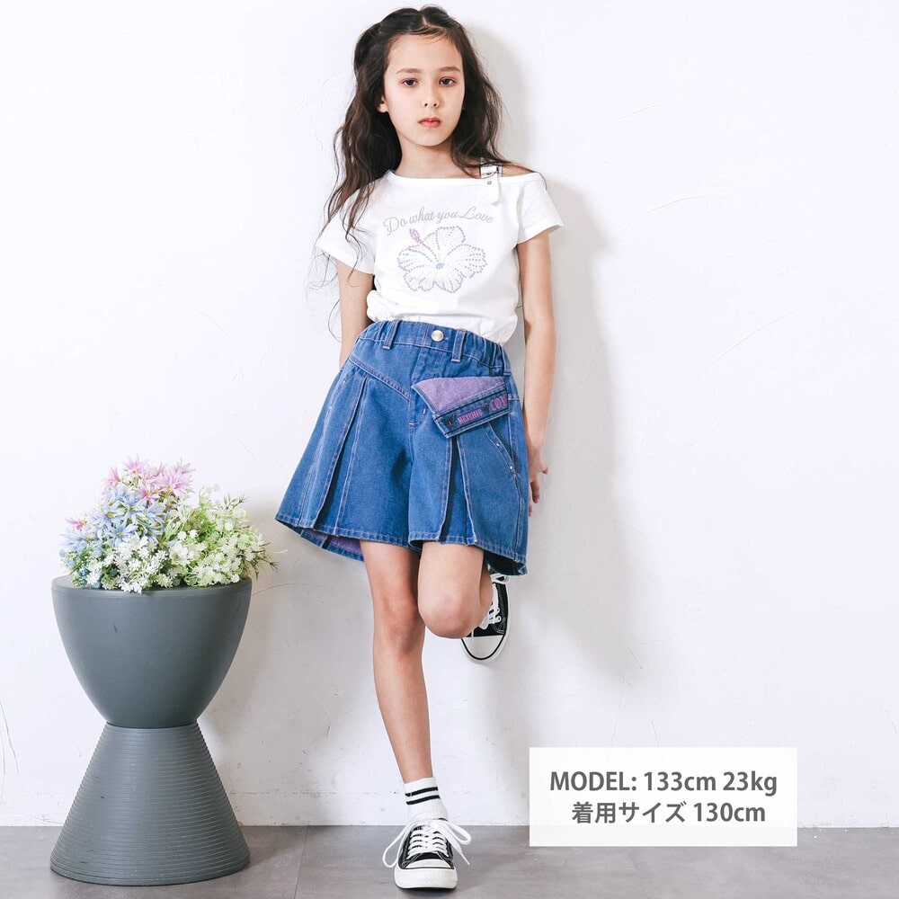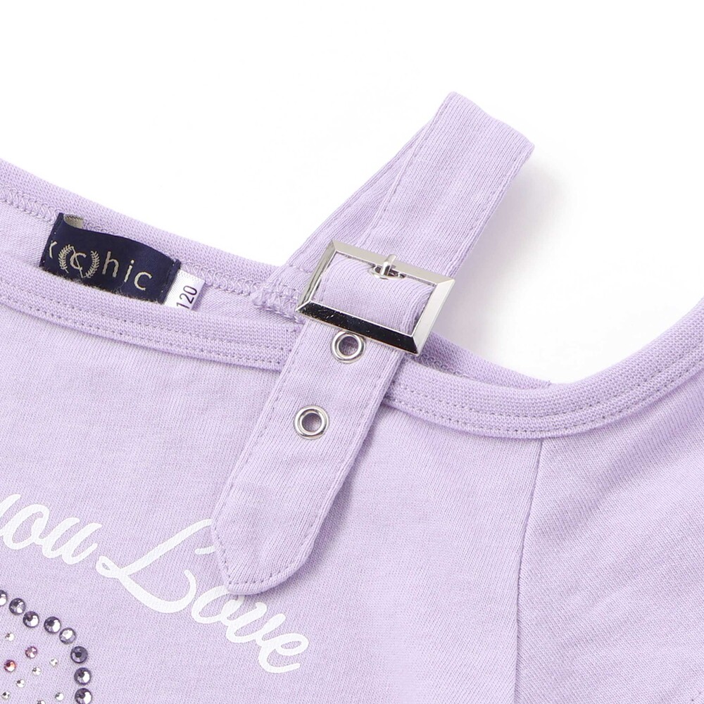 肩部分にはハトメとバックルを通した飾りベルトをあしらい、ストリート感のあるアクセントをプラスしました。