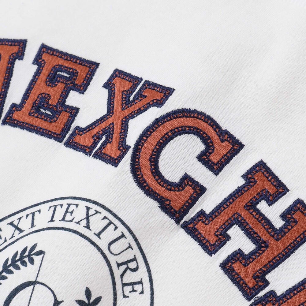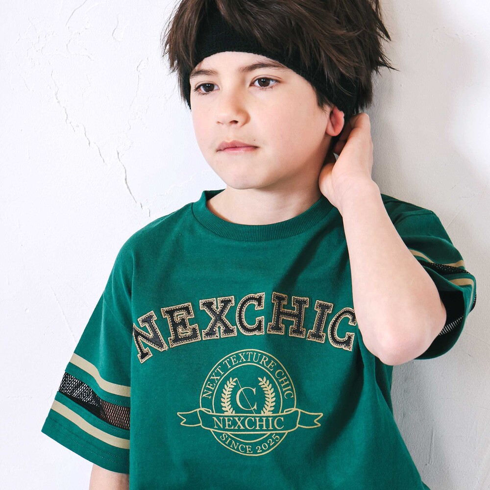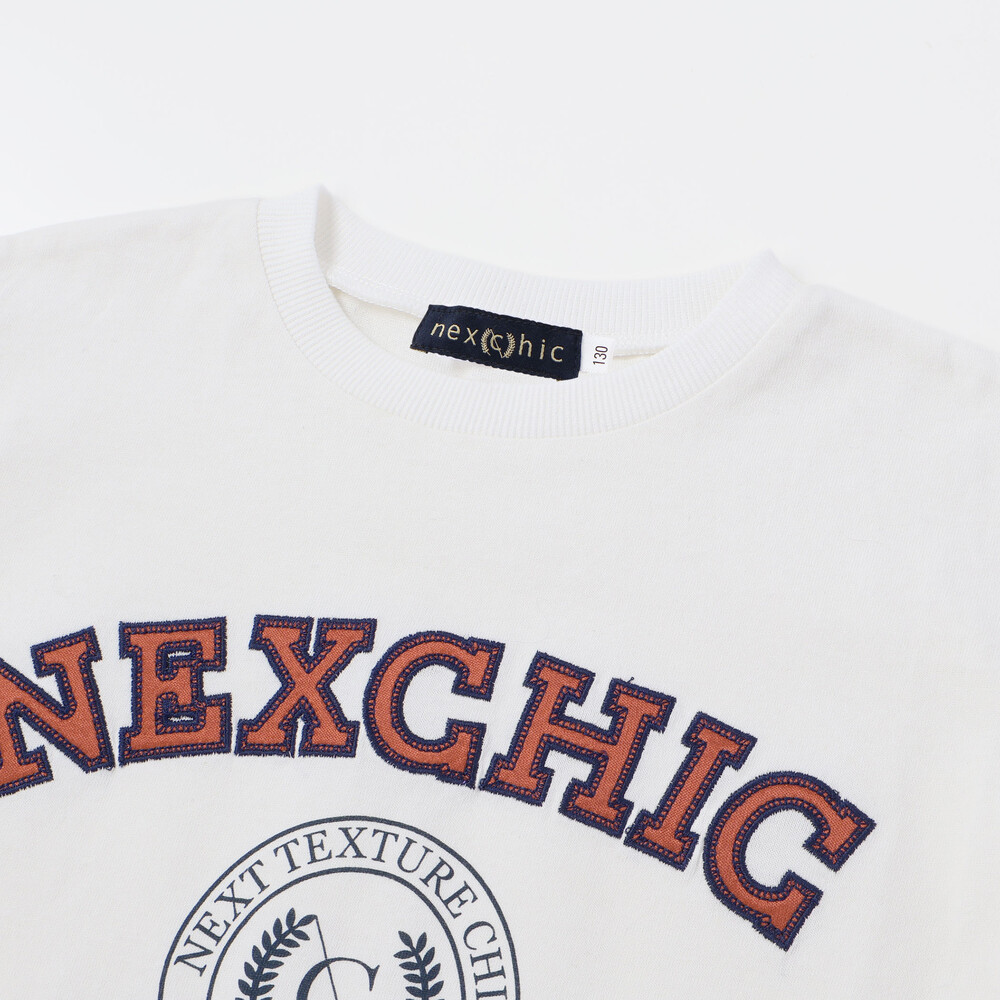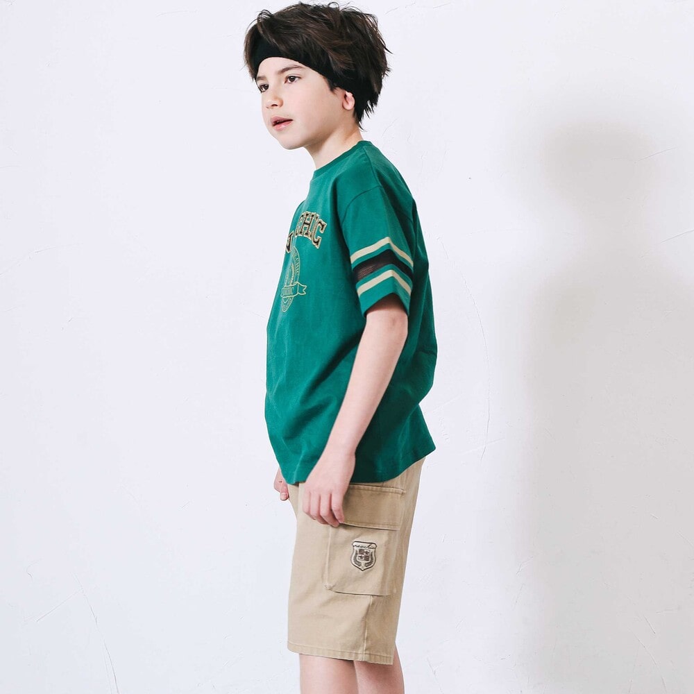 カレッジ風パッチが目を引く男の子用半袖Tシャツ。