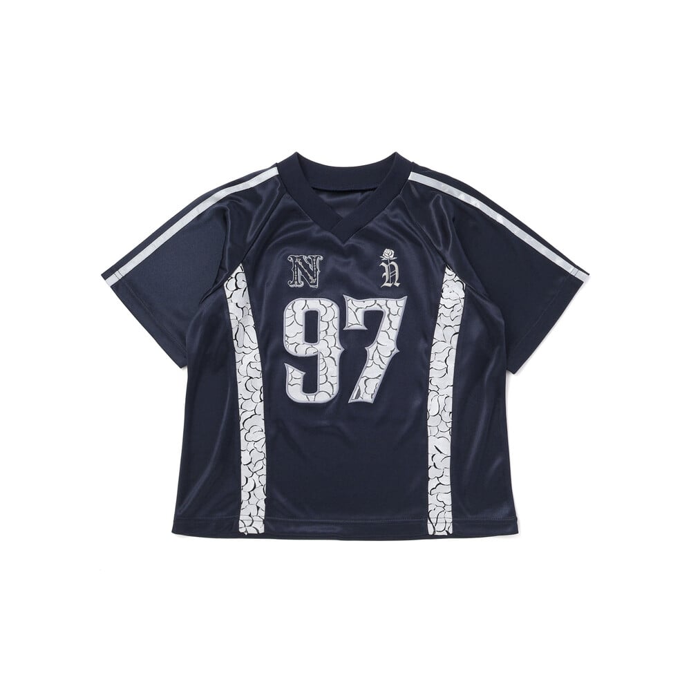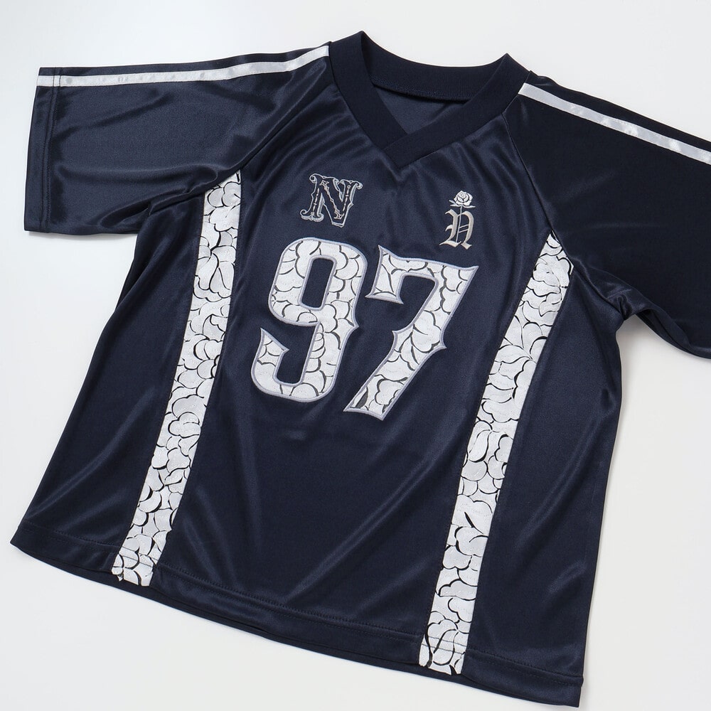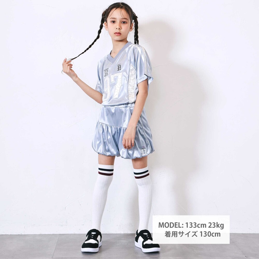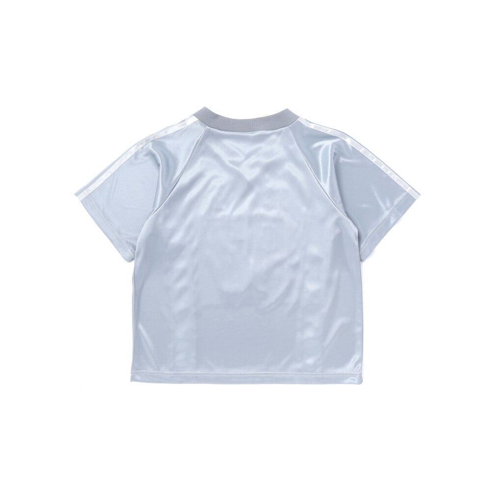 スポーティーなユニフォーム風の形でありながら、レースの透け感とサテンテープのアクセントが、フェミニンな印象を与えます。
