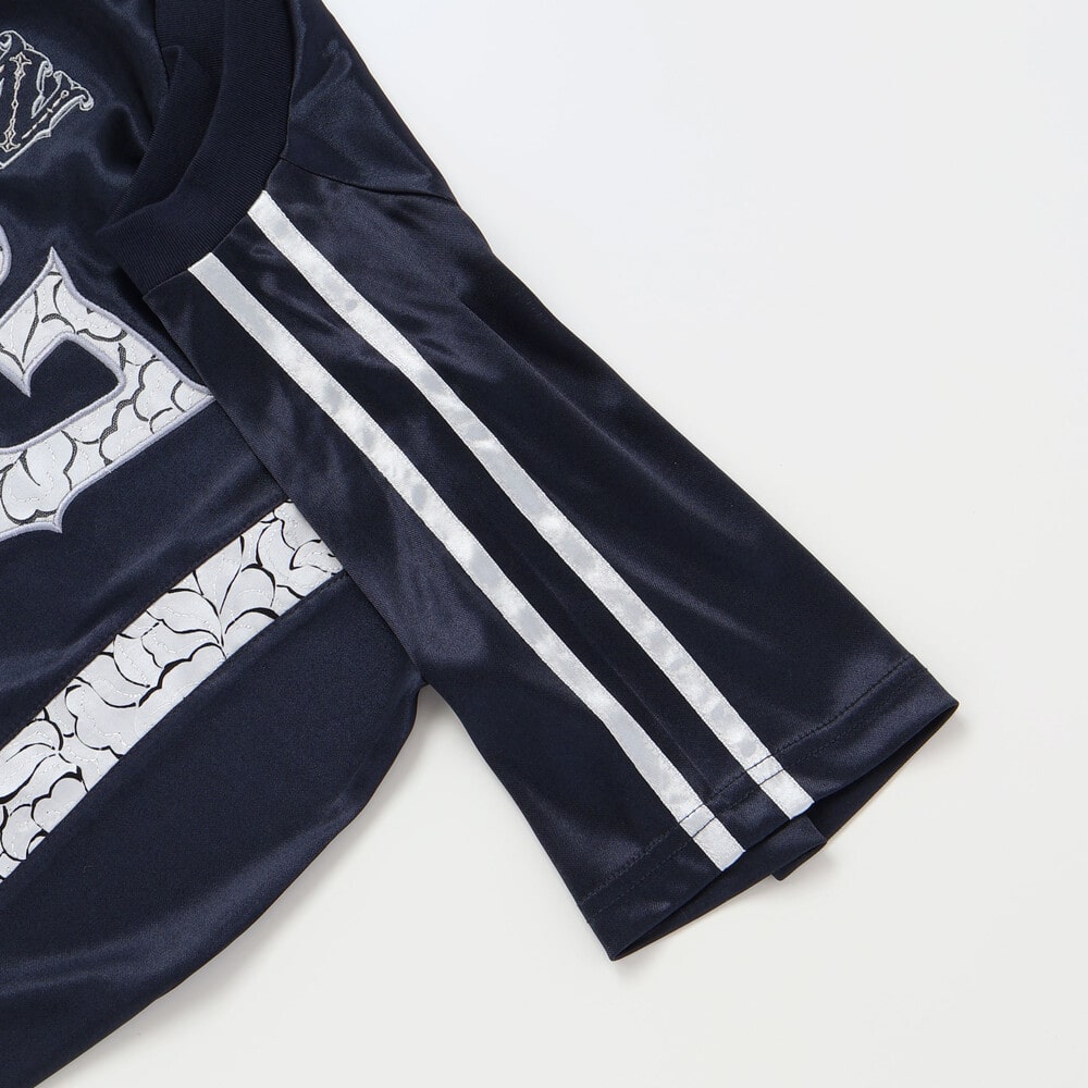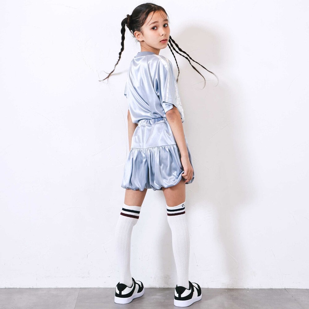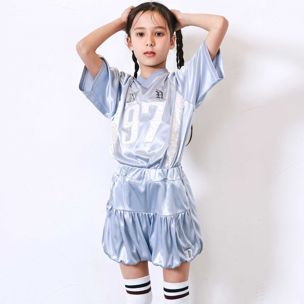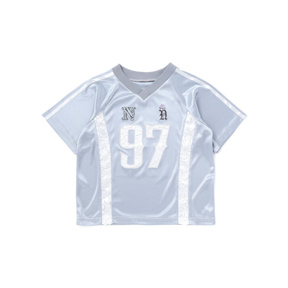 サテンの光沢とレースの透け感に、優雅なバラの刺しゅうを添えた女の子らしさが光るスポーティー半袖Tシャツ。