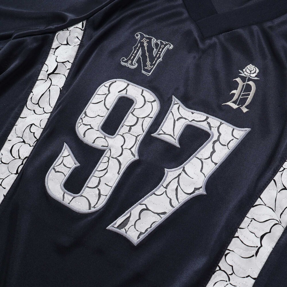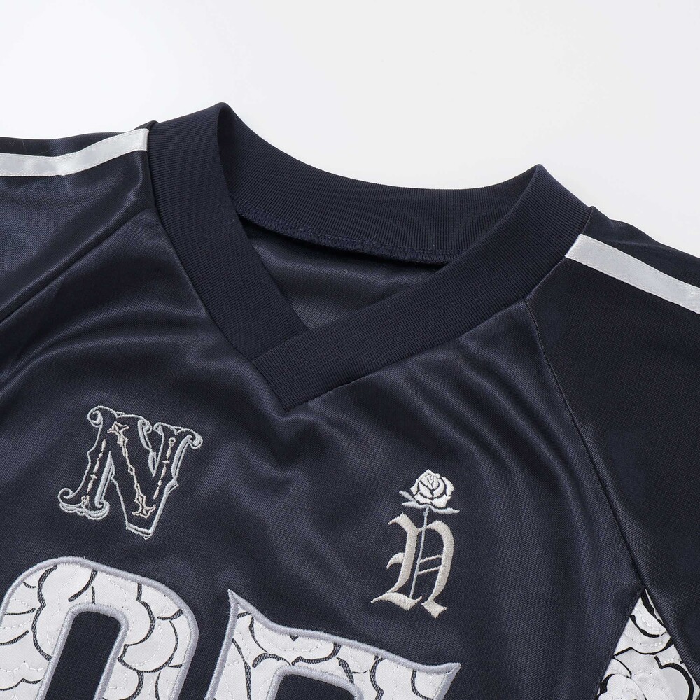 胸元には、クラシックなフォントのイニシャルに一輪のバラを絡めた、繊細な刺しゅうを配置。