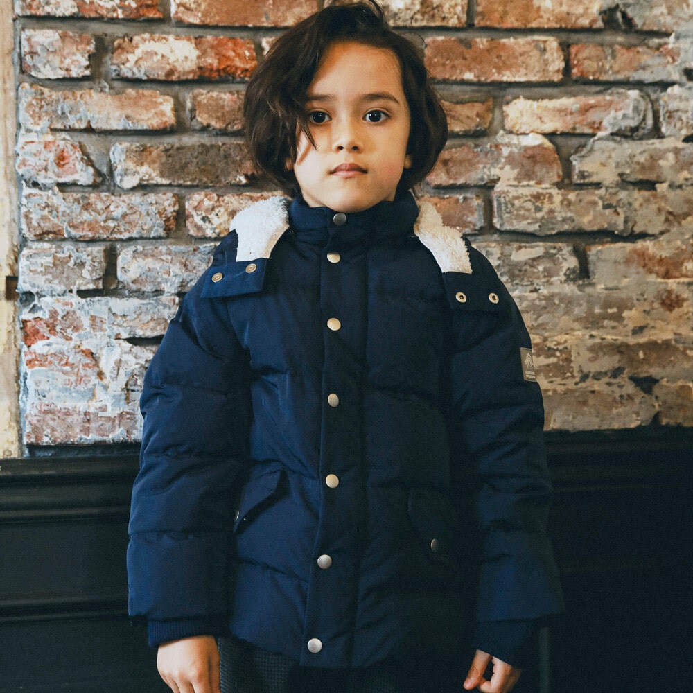 撥水加工素材を使用した男の子用フード付き中綿コート。